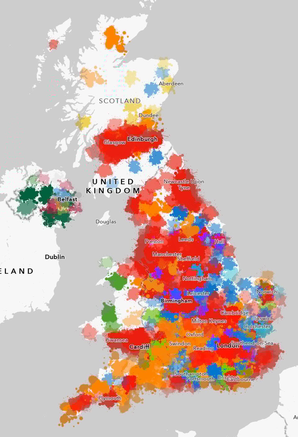 The intent is to show a much more fluid political landscape rather than one that is tightly constrained by the constituency boundaries. Yet, curiously, when the amount of different colours are assessed the map exhibits 45% red, and only 4% blue which is at least closer to the actual results than the traditional geographical unique values map we began this post illustrated. So it could be argued, despite its apparent abstract nature, that this map actually gives a better expression of the overall results than a seemingly more traditional map.