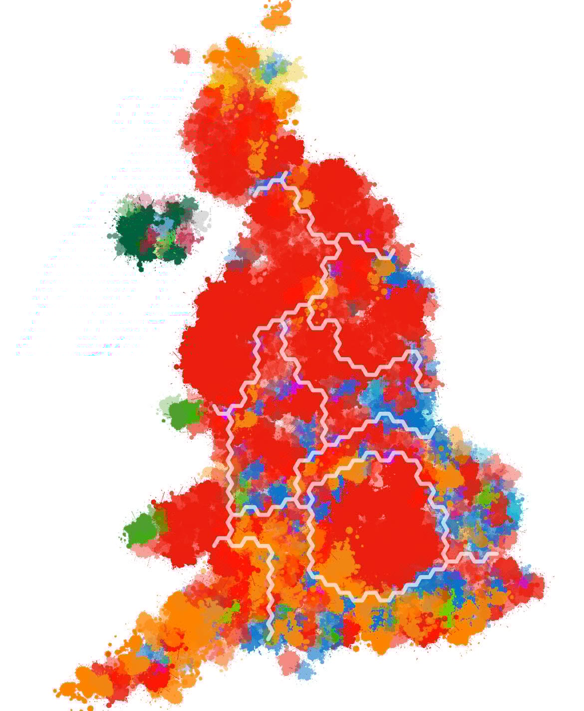 Finally, let’s go from one extreme to the other. In other words, from a map where the data is on the map itself, to a map that’s completely abstract. For the 2015 UK General Election I created a map I described as illustrating the messy nature of elections. I titled the map ‘Election Pollocks’ as a nod to the abstract expressionism of Jackson Pollock. So I’ve simply recreated that map with the 2024 data.
