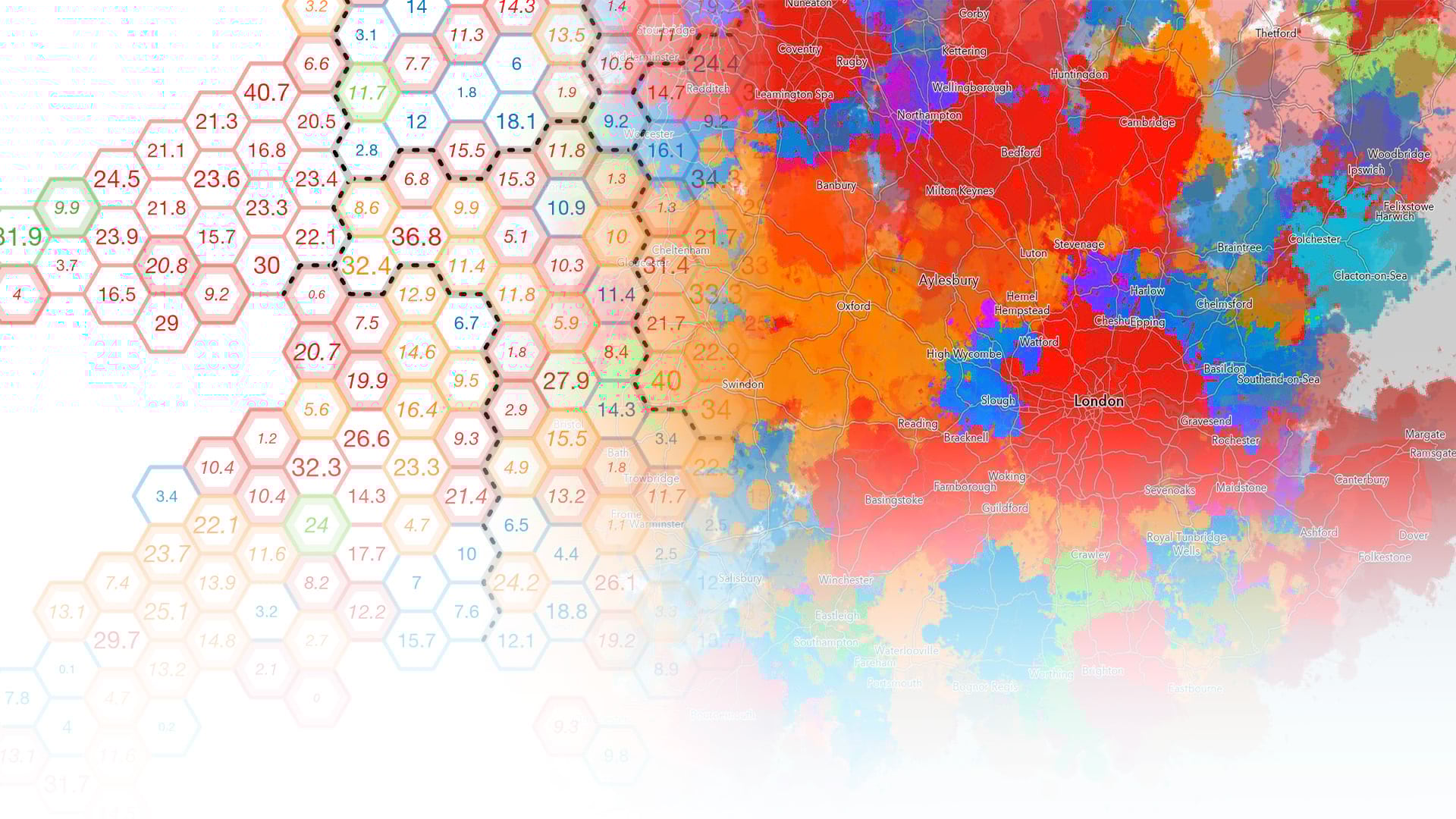 If it appears like there’s no internal mini-hexagon it’s because it’s the same colour and the constituency was won by the same party in both years. A colourful map, but one that helps understand the pattern of change between election cycles.