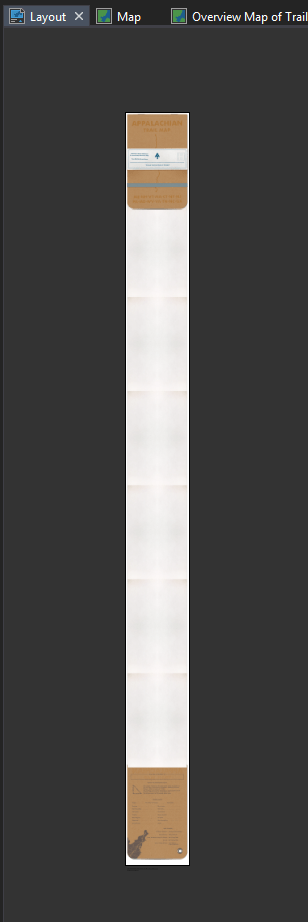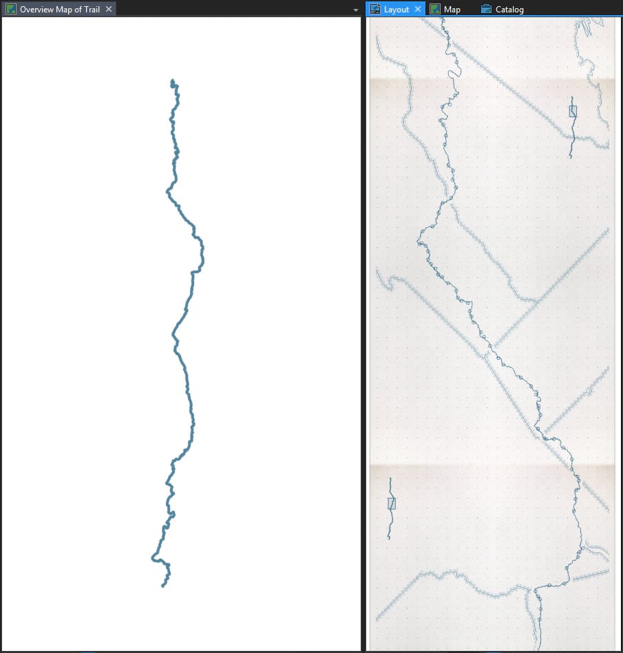 Since the idea is that this is a tall fold-out map, the imaginary map user/hiker would fold the map to their current location. So a small reference should be added to each page view. In a separate map in the Pro project I generalized the line, and added six instances of it to the layout, positioning each appropriately. Then I drew a rectangle (insert > rectangle) over each page’s extent.