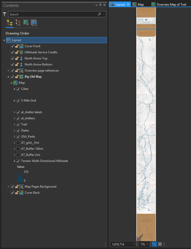 Using the “Generate Tessallation” tool, as I am wont to do, I created a grid of 25 square-mile cells on the map. This means I get a line every five miles. That seems like a handy reference for a hiking map of this scale. And it means we don’t have to make a lame scalebar.