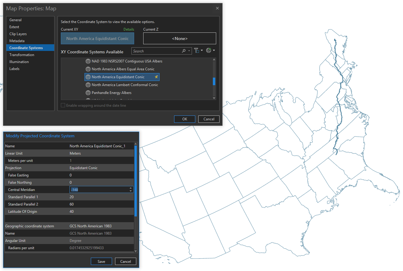 An equal-distance projection was important in this case, since I wanted the trail’s true length to be consistent along from start to finish. I chose North American Equidistant Conic. I modified the central meridian until the trail was vertical (a nice little hack for re-orienting conic projections).