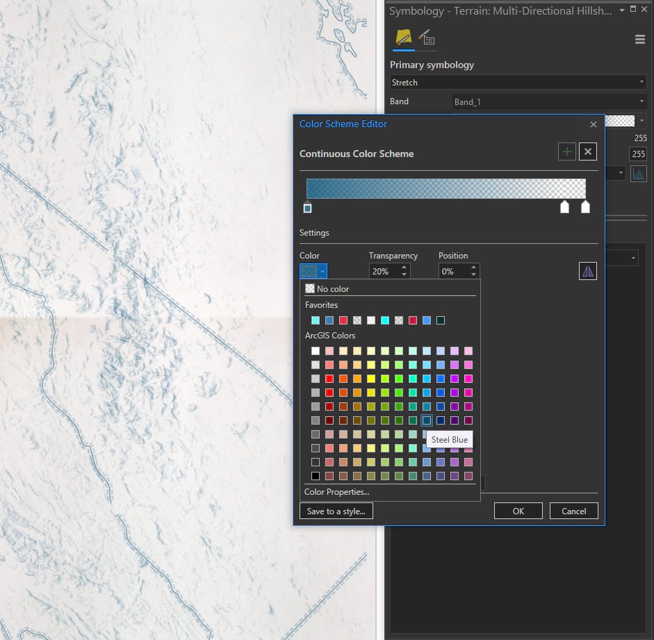 The topography is a somewhat muted reference for the terrain along the trail. I started out with contour lines, but I find often contour lines a bit more complex than is necessary. In this map, hillshade seemed to do a good job of indicating the terrain of the journey without overwhelming the map (or its owner). I gave the hillshade image service a color gradient of opaque in the shadows to transparent in the highlights. Has a nice clean appearance to it. Monochrome!