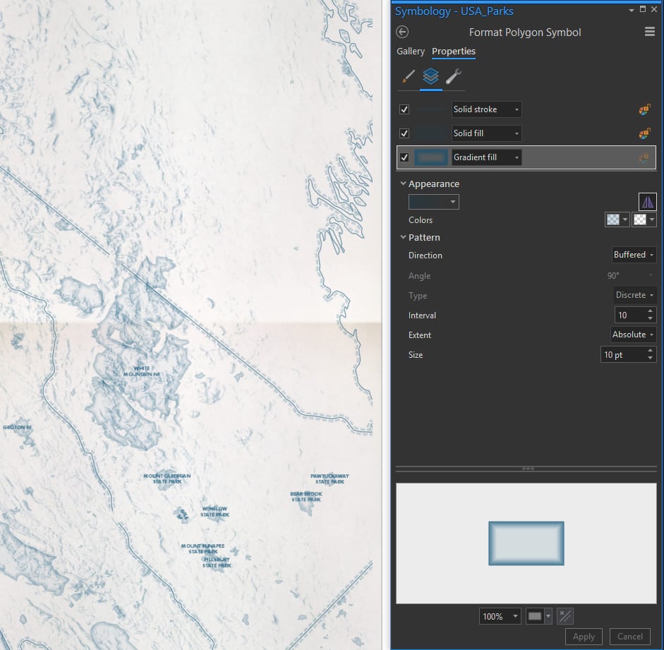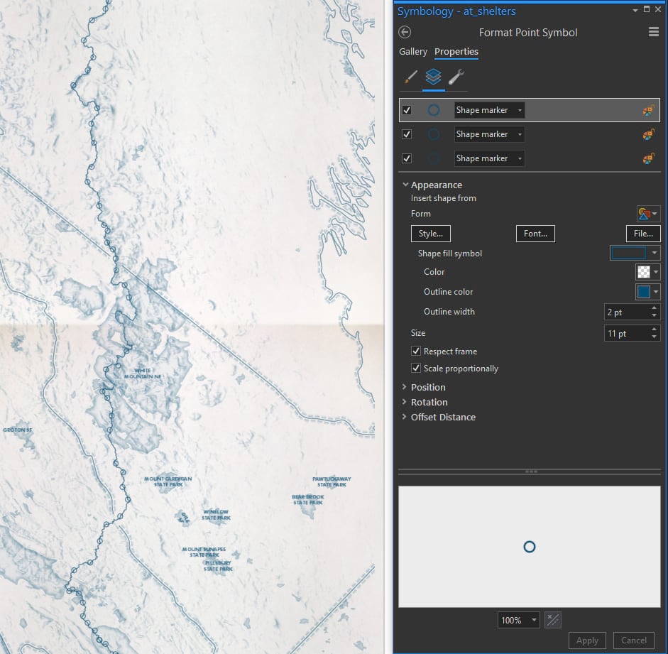 You might notice the occasional gap in those state lines. To reduce the visual complexity of where the Appalachian Trail crosses over state lines, I made a buffer of the trail and used it to mask the state layer (appearance > masking).