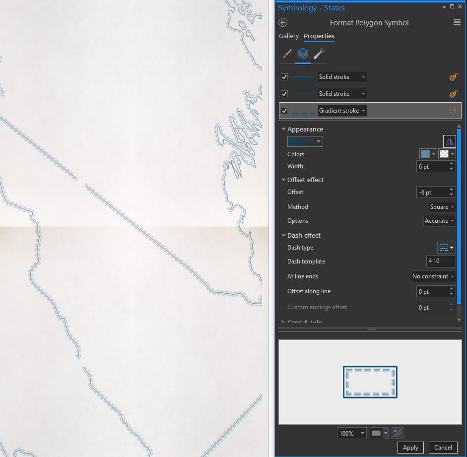Because the nature of this map is an inherently winding linear feature, I found that I had to push the symbology of referential state borders to something quite different. I like the dashed effect of political borders (representing their purely cultural significance), but I found that by using an inner gradient on that dashed line, I helped communicate neighboring “things” and also differentiated the occasional appearance of an ocean coast.