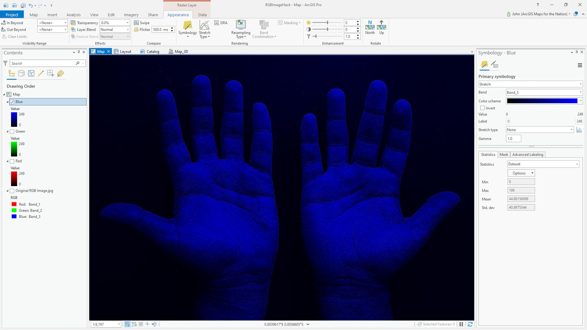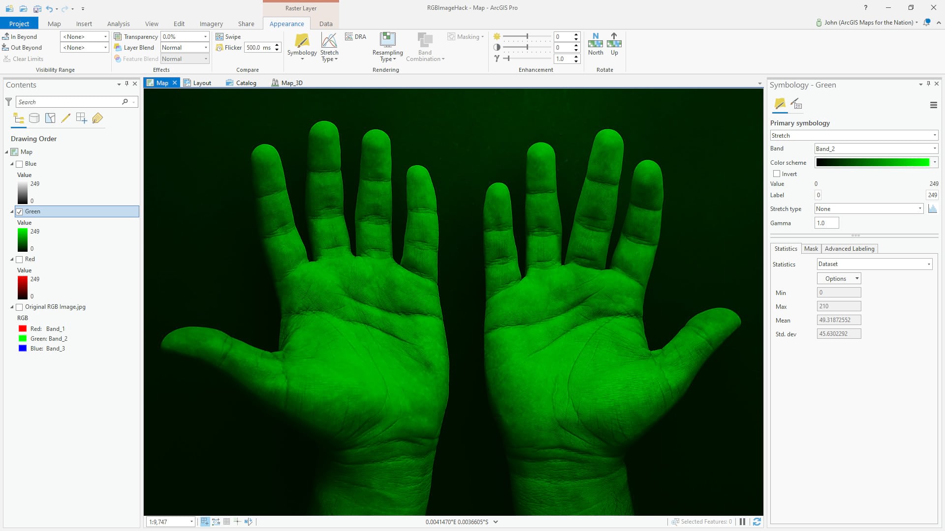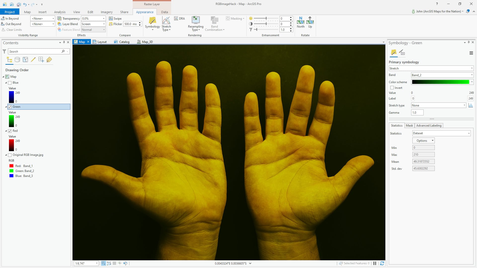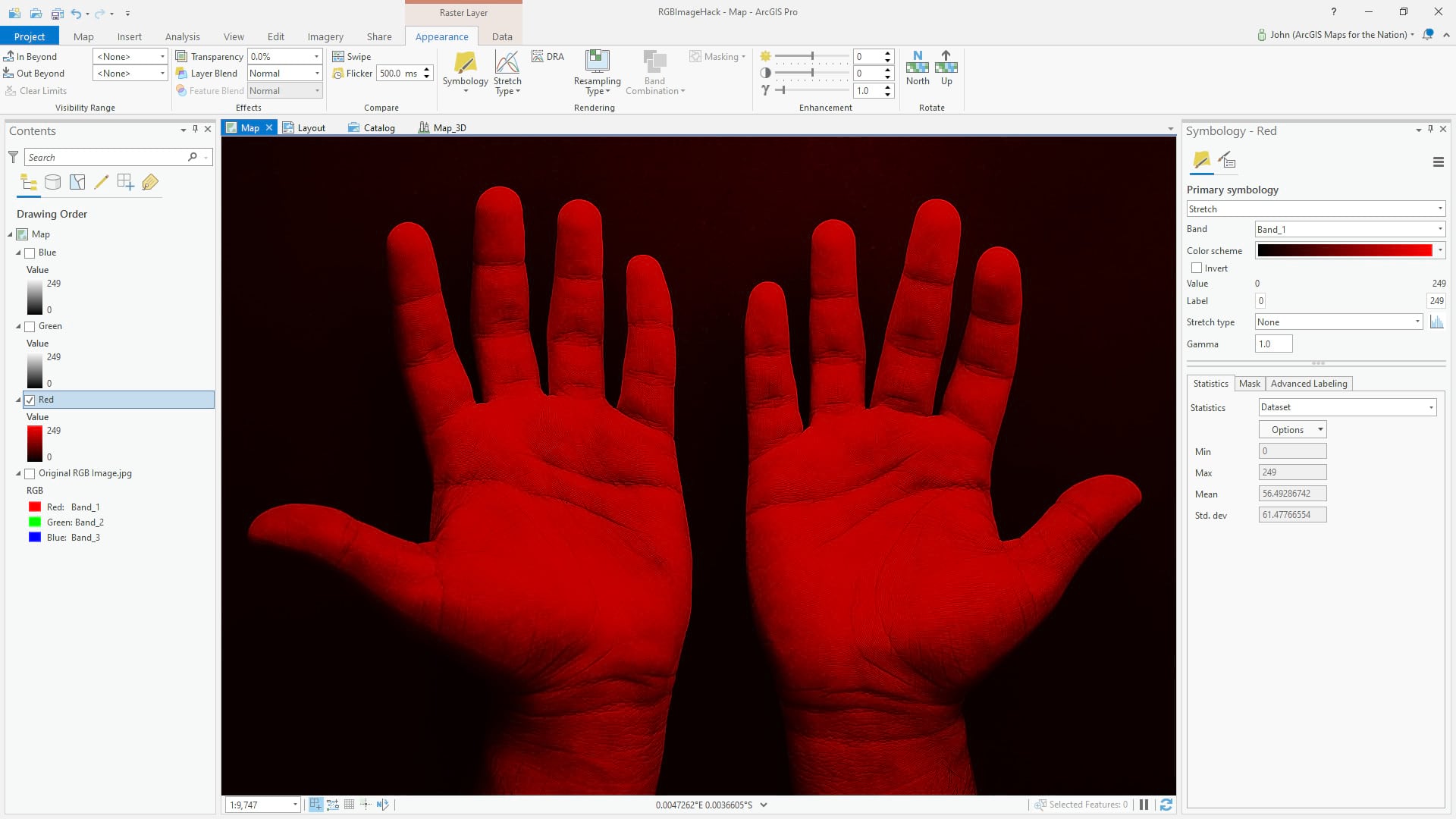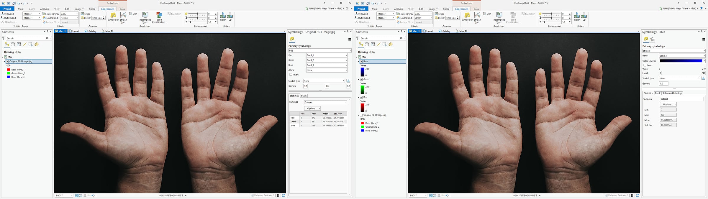But we don’t have to show a three-band image with three bands. Here is a copy of the image (right-click the layer, copy/paste), with just the red band; I changed the symbology from three-channel “RGB” to one-channel “stretch” and selected band 1 (red). The result is a grayscale image of how brightly the hands reflect red light.
