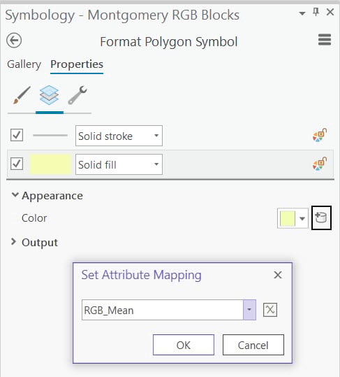 The attribute containing the average RGB color values for each block can be read directly in ArcGIS Pro and used to color each block polygon’s fill: