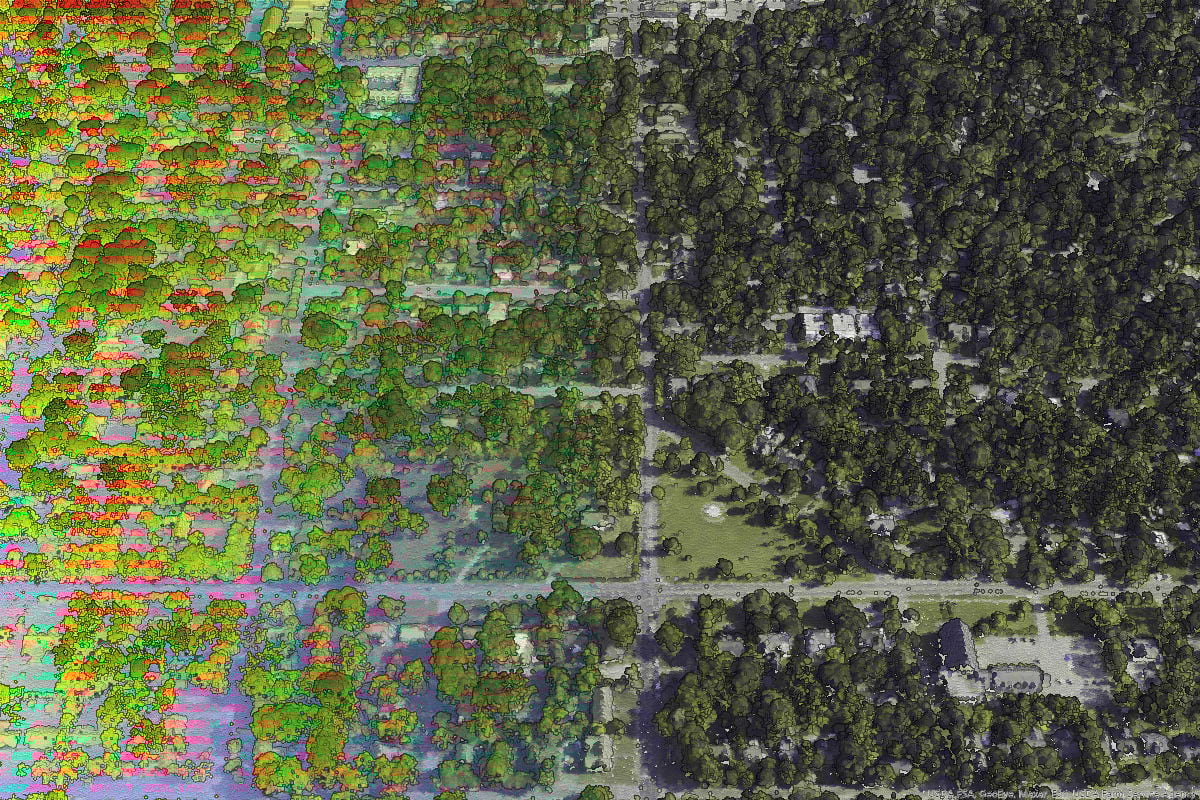 To put a metric on average tree heights in the different HOLC grades, we used the 3D Basemap Solution to extract individual tree points from the Lidar. In this workflow, a normalized digital surface model was created, which represents the height of objects above the ground. From this surface, the solution uses hydrologic tools to detect “reverse sinks”, which represent the center (top) of each tree and includes individual tree height attributes. These points can then be visualized as realistic 3D models – or analyzed, as we showed by determining the average tree heights in grade “A” versus grade “D” HOLC neighborhoods.