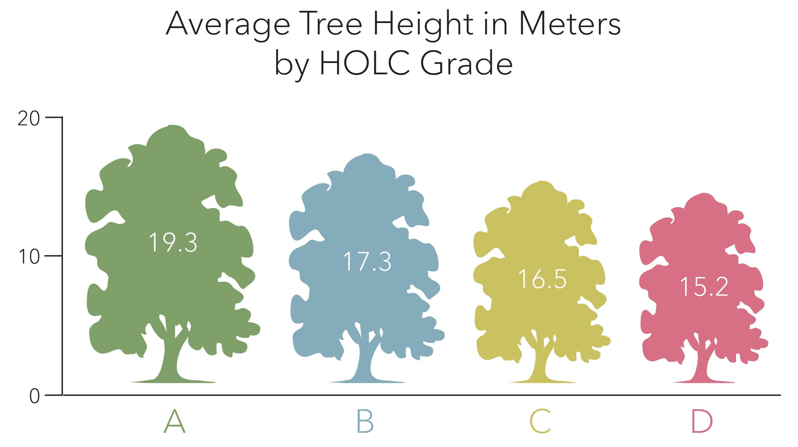 While some individual neighborhoods had greater height differences, the averages across all HOLC grades in Montgomery shows a consistent relationship between HOLC neighborhood desirability and tree height. This is enforced by the neighborhood descriptions of the period, which often use words like “shady” or “wooded” for “A” grades. Almost 100 years after these neighborhood descriptions were written, these environmental disparities persist.