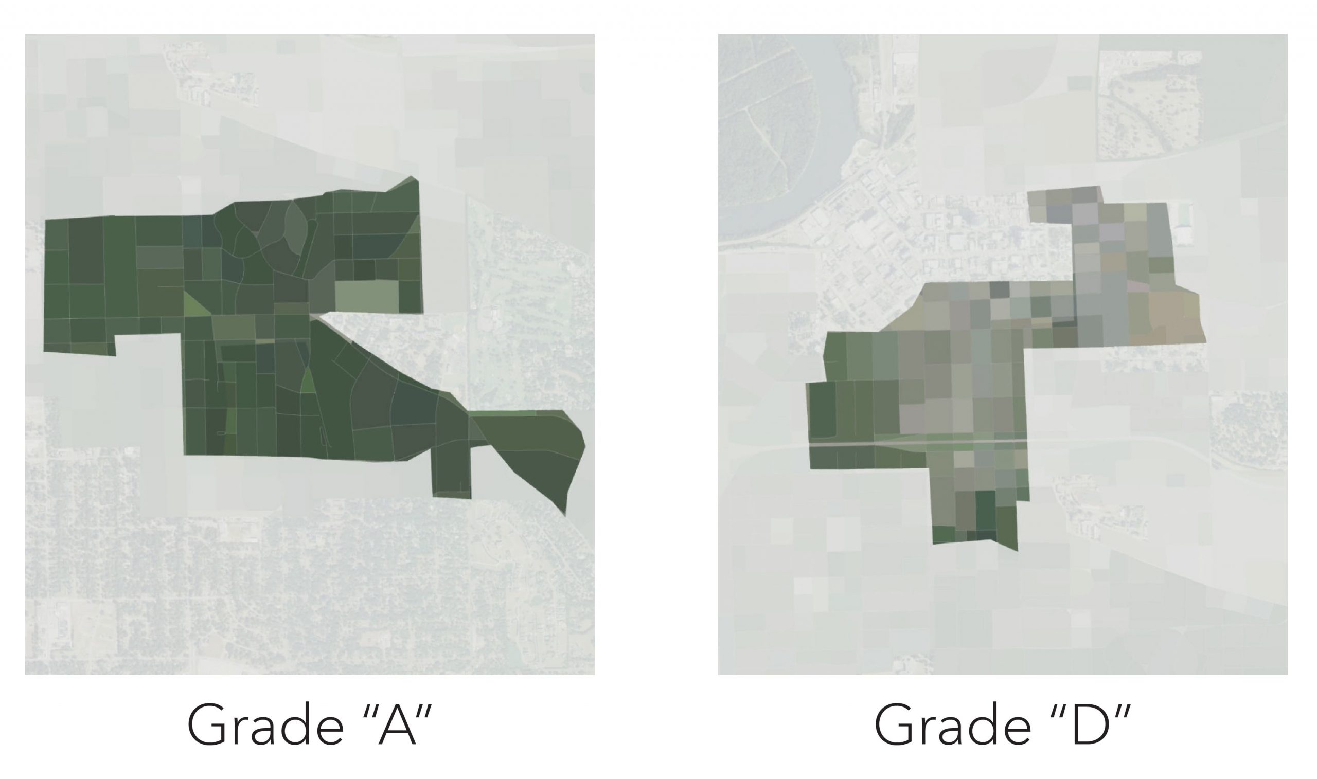 Unfortunately, this tessellation approach introduced some problems with the unpredictable shape, size, and orientation of the HOLC neighborhood polygons. While exploring ways to get around the alignment issue, the answer was looking us in the face; why use a regular grid to approximate the size of a city block when we can use the physical barriers of the street network to generate actual city blocks. Individual blocks tend to be fairly homogeneous in their land use and vegetation cover in a city, so they made sense as the unit of analysis. This block-based analytical approach was then applied to several of the other cities in the story.