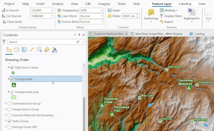 Let’s look at this in action. We’ve got a multiscale map of Yosemite National Park; its layers use custom symbols designed to certain specifications. The style of labels are dependent on the map’s scale. Two different layers depict camping grounds, and as such, the label and symbology settings are different for them.