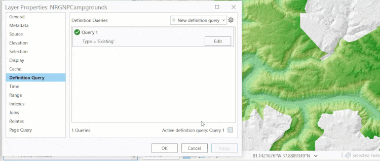 Here’s another related but practical example. Let’s say we’re looking to build a similar kind of map for the (relatively new) New River Gorge National Park in West Virginia. I assembled this point feature class of campground locations within the park. We didn’t modify the layer’s label or symbology settings.