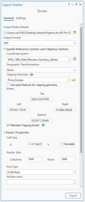 I added the Terrain imagery layer from ArcGIS Living Atlas of the World to my map. On the Contents Pane, I right clicked the layer, hovered over Data, and chose Export Raster. In the pane, I set the National Park boundary as the Clipping Geometry and checked the “Maintain Clipping Extent” checkbox. To make sure I could use the raster with any Geoprocessing tool, I modified the values of the Raster Size Columns and Rows to conform to this.