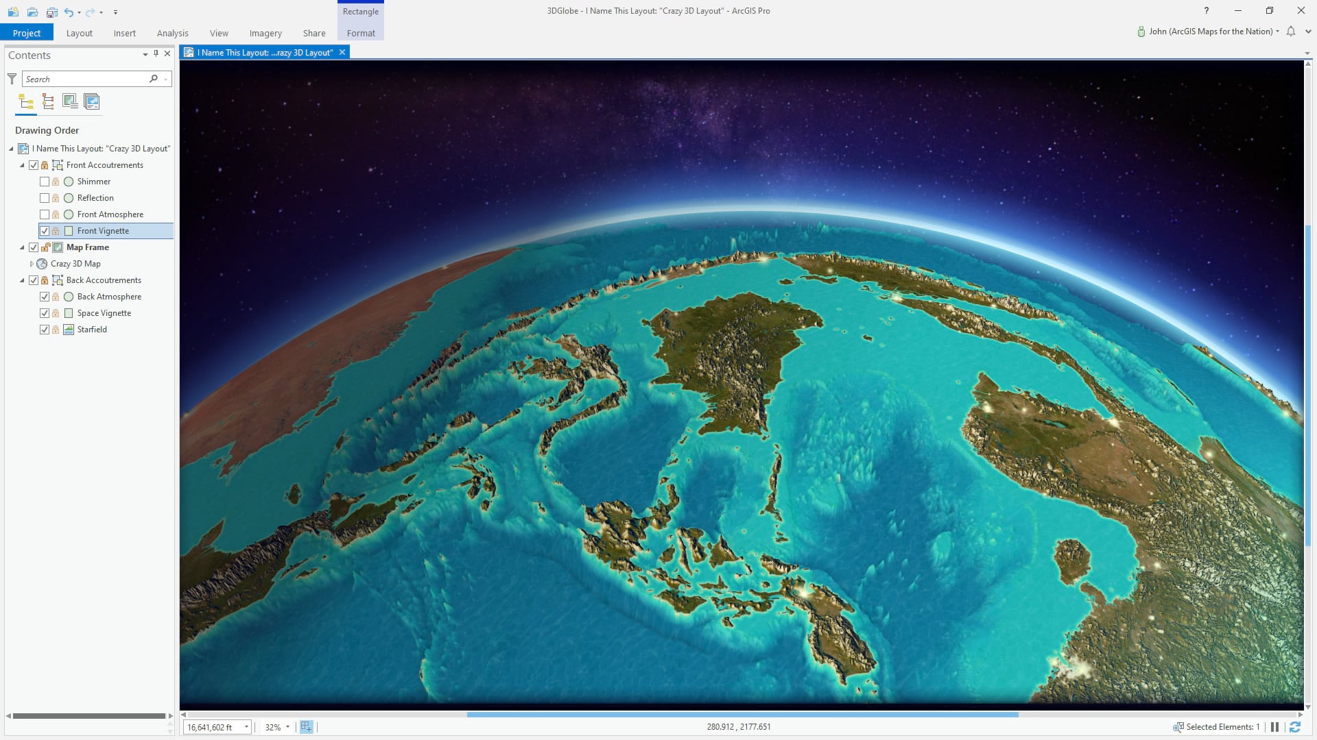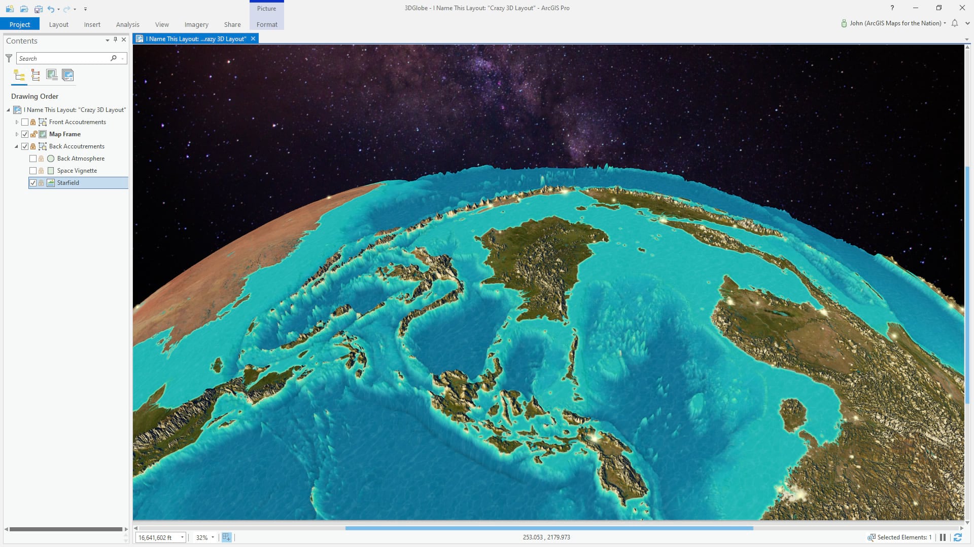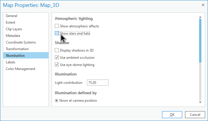 There are all sorts of wonderful reality-driven scientifically-valid cosmically-and-mathematically-sound options for the built in starry background and atmospheric lighting effects in ArcGIS Pro. They are wonderful and powerful and I encourage you to investigate them. Later. Today, we are casting all of this to the side so we can hack in some outlandish (I mean that literally I suppose) star and atmosphere effects. Ok? So uncheck that option; we are going to wing this.