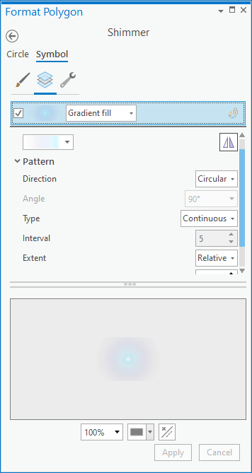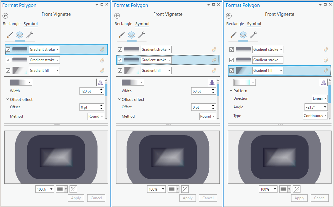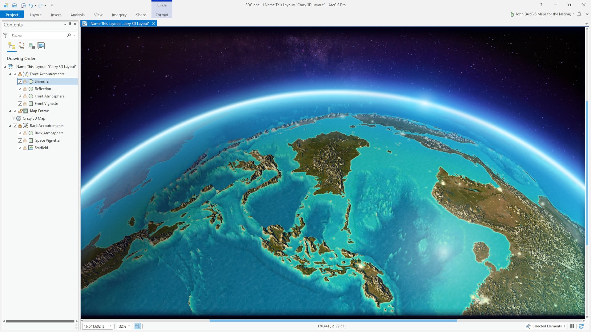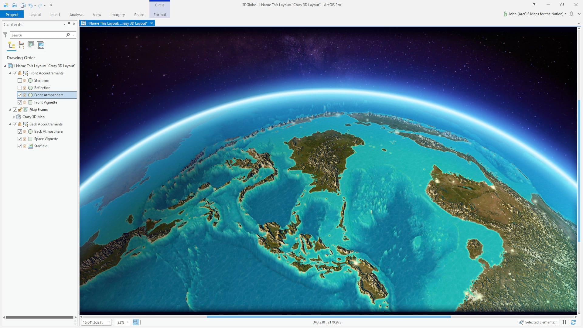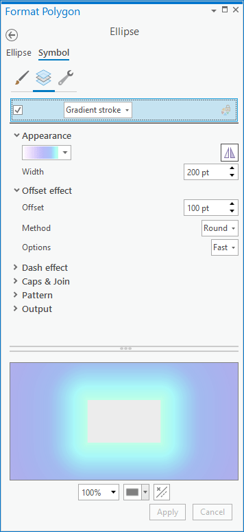 Ready for this friends? Once more via the Insert menu, we are going to draw in an ellipse that roughly matches the curve of the earth. Like the star image, drag this shape below the map frame so that is draws behind the globe. We are going to style this up into an ethereal glowy atmosphere. Right-click the ellipse to open its properties dialog, and select the “Symbol” tab. We can treat this just like a map polygon. Rather than a solid black stroke, set it to a gradient stroke, and play with the gradient (the dropdown in the “Appearance” section) so that you have a light blue opaque beginning, and fade to a fully transparent purple at the end.
