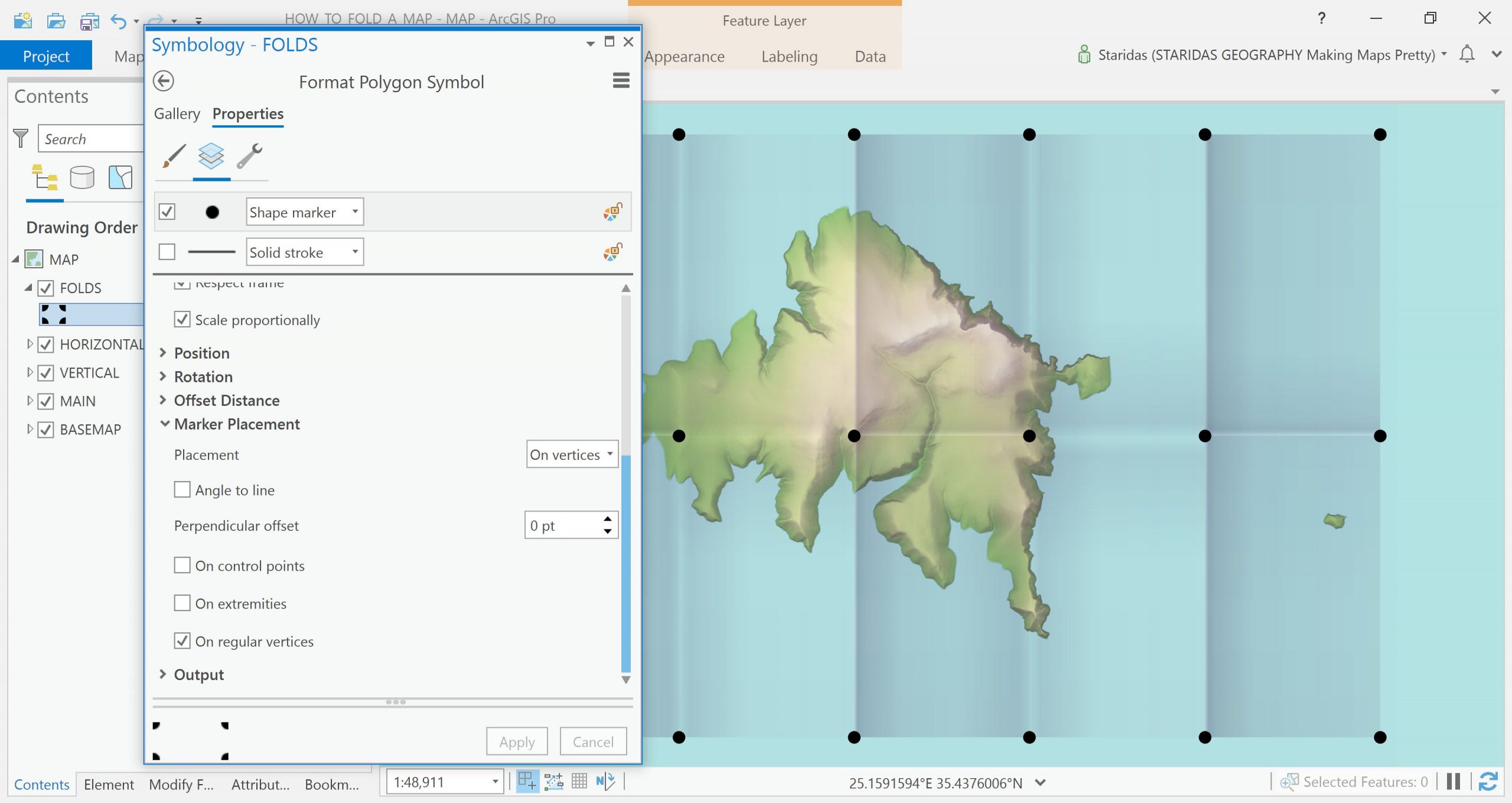 In order to understand the folds’ vertices, I will symbolize this polygon layer with a marker symbol layer, which I give an “On vertices” placement.