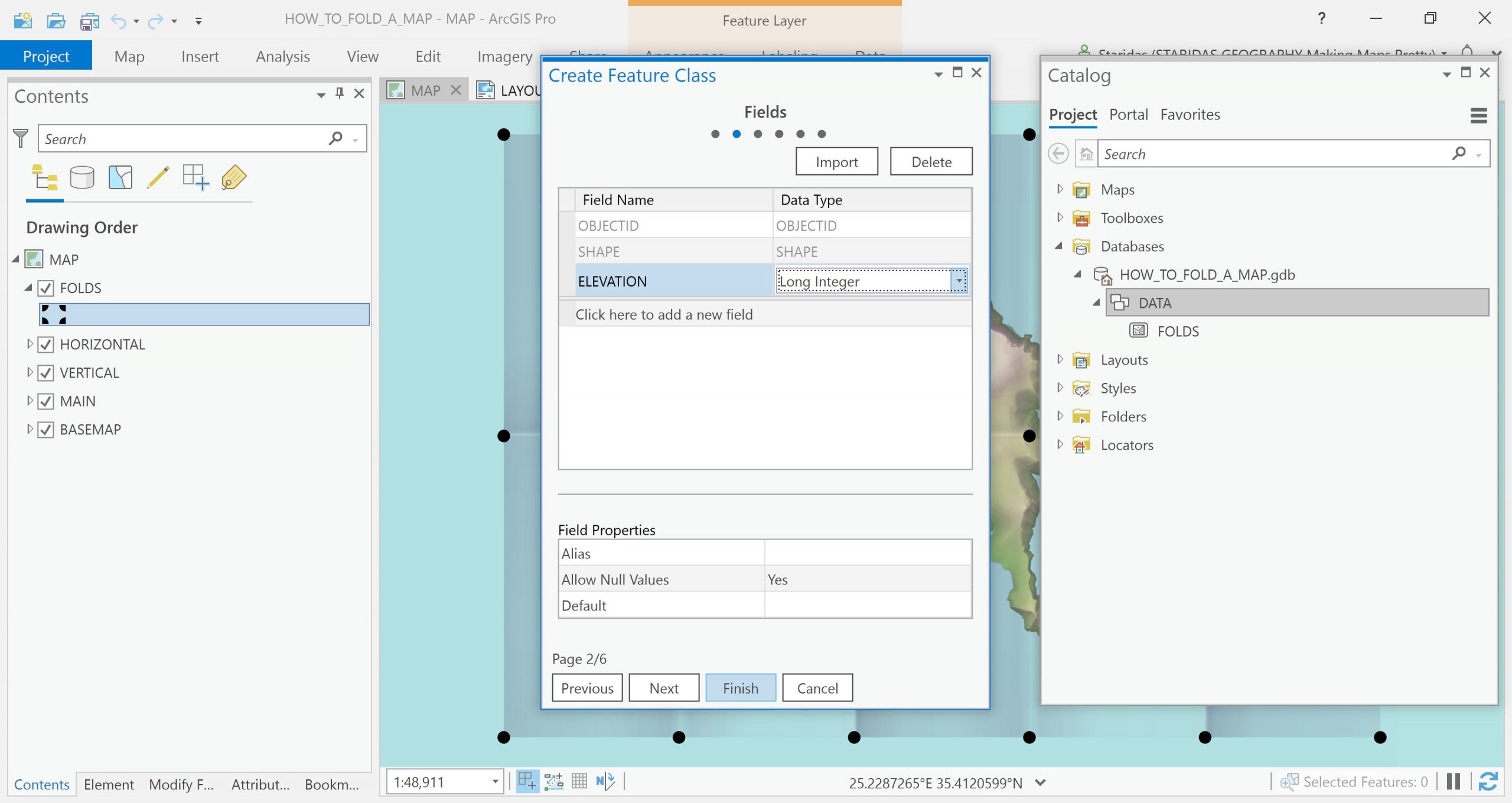 Let’s dig in. In ArcGIS Pro I open the Map View of the map I have been working so far and I add once again this super handy grid polygon feature layer, which simulates the folds.