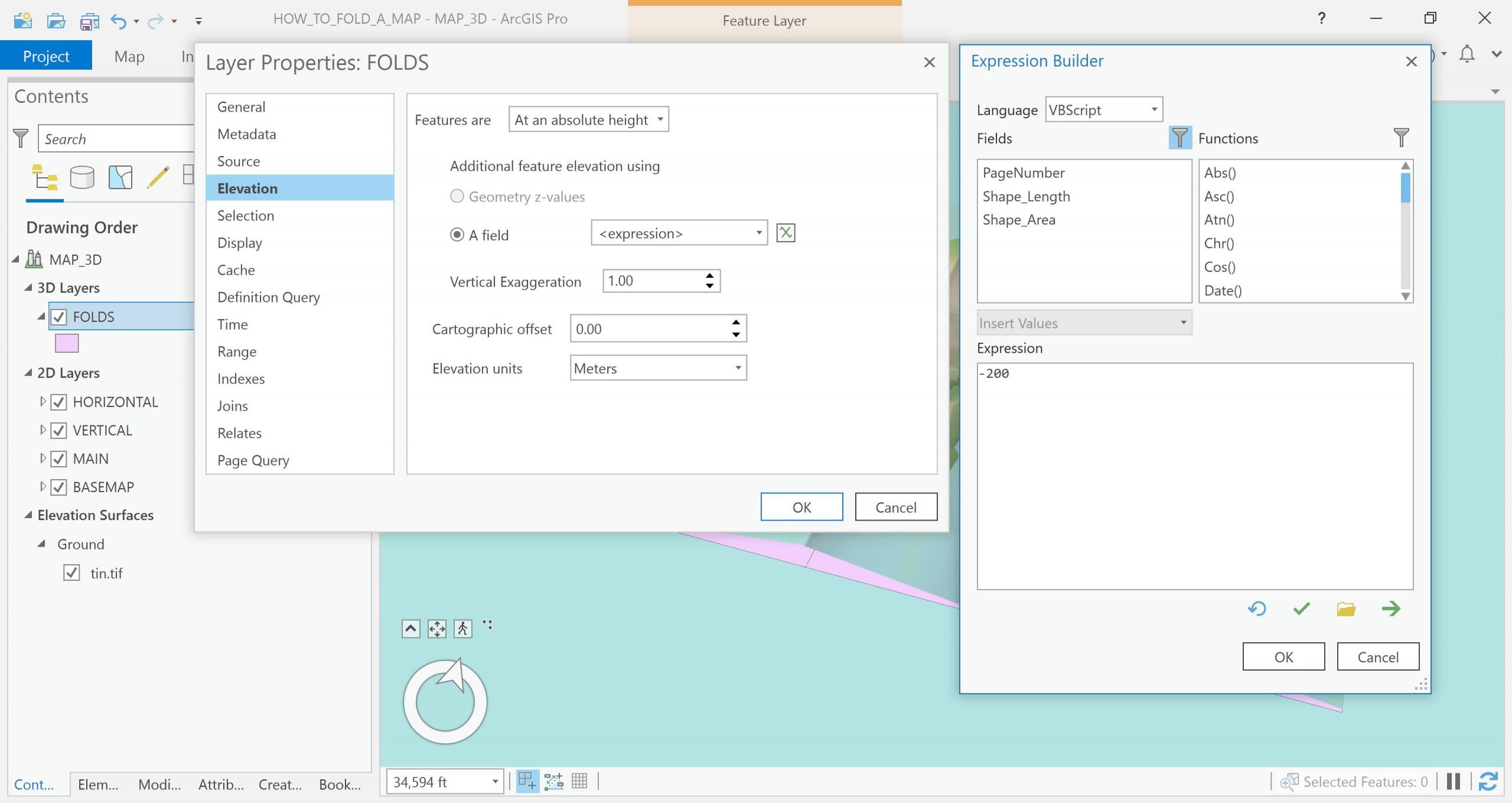 From the Layer Properties panel, at the Elevation tab, I select these features to be “At an absolute height” and I adjust the “Additional feature Elevation using” an expression via the Expression builder. I actually tell Pro to push that layer 200 map units below the map.