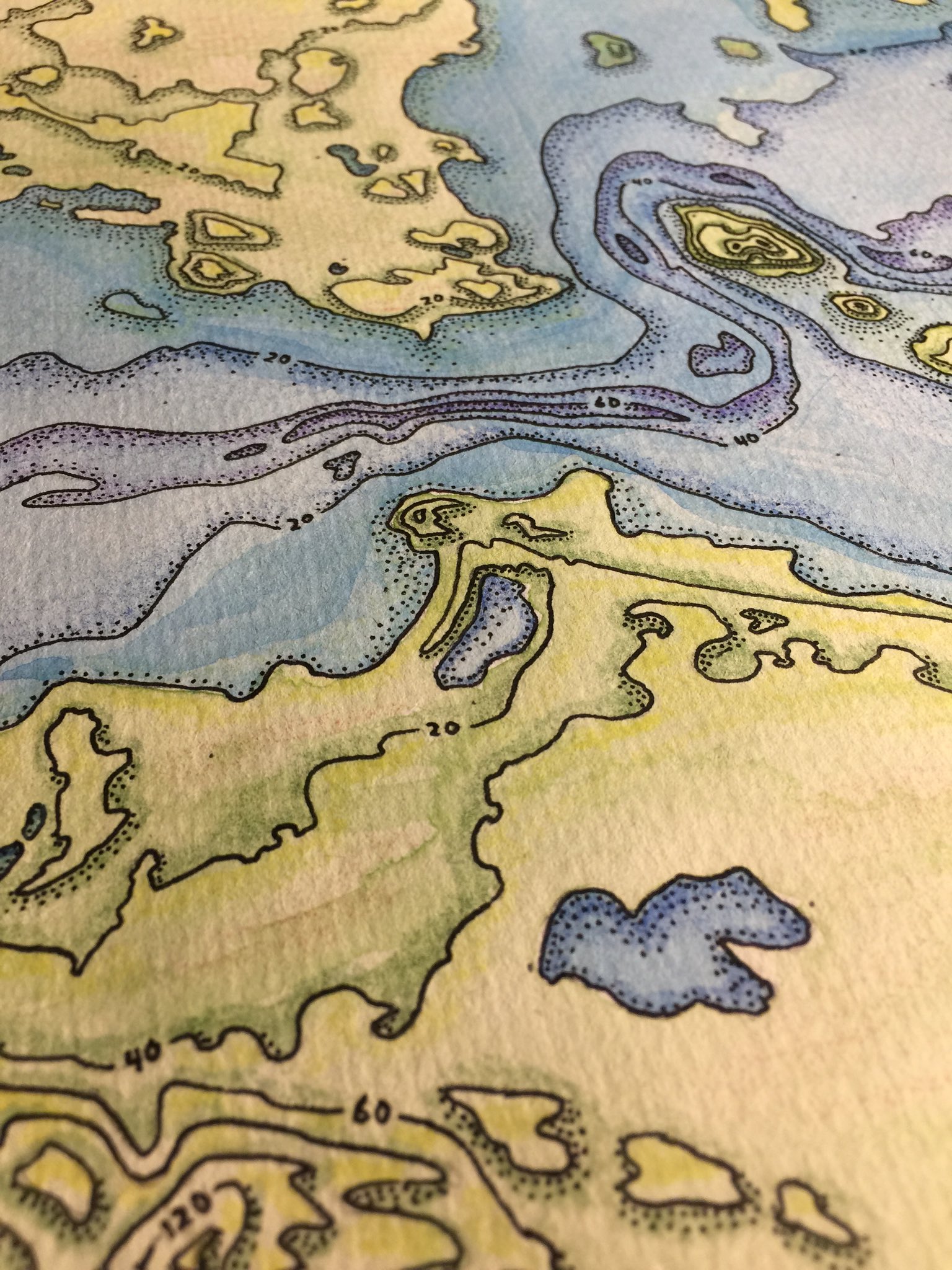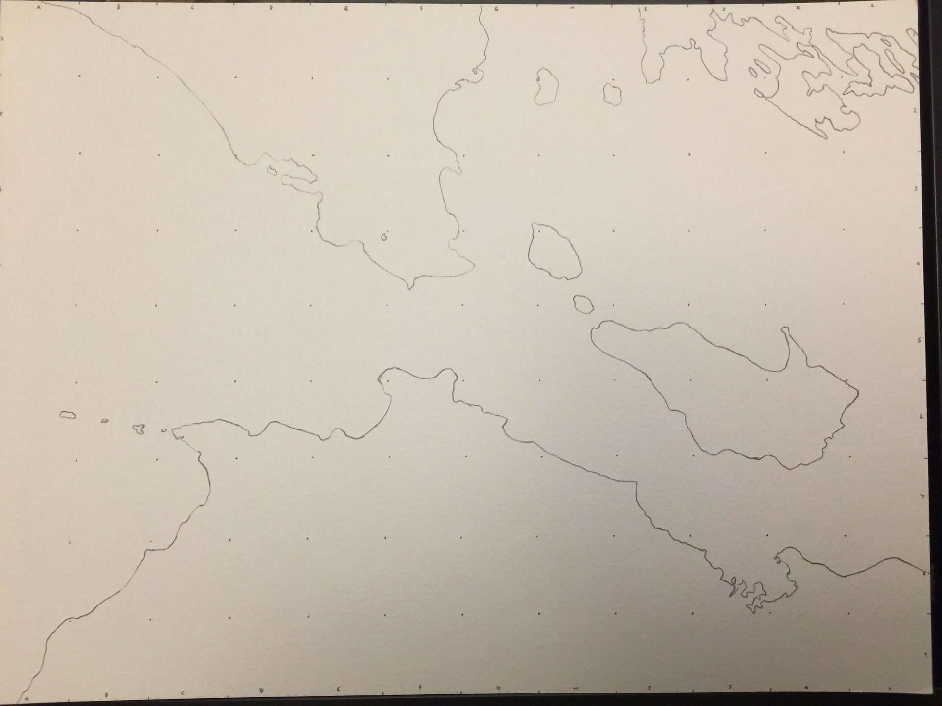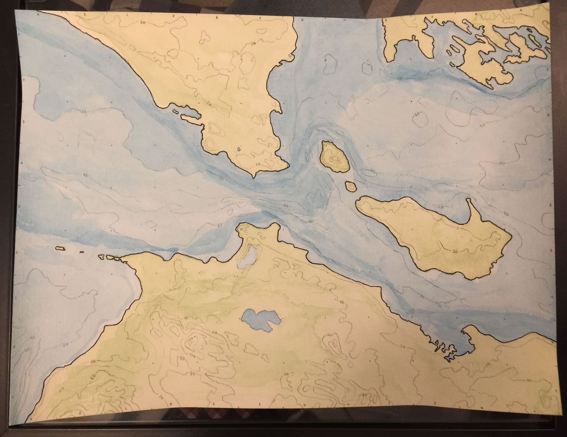 This recent dive into hand-drawn mapping is a new one for me. I had’t actually drawn a map since I was a kid. There was a remarkable feeling that came with the process that, if I’m being honest, I sort of expected. The tangible process of using my hands to apply graphite, ink, and paint, to a sheet of actual paper brought me closer to the not just the intrinsic awesomeness of the craft of cartography, but provided a vigorous appreciation for how easily things can be styled and manipulated in the digital environment. Want to nudge the composition over a bit to the east? Forget it. Paint over a couple islands in the northern bay? Oops -scratch some green colored pencil atop.