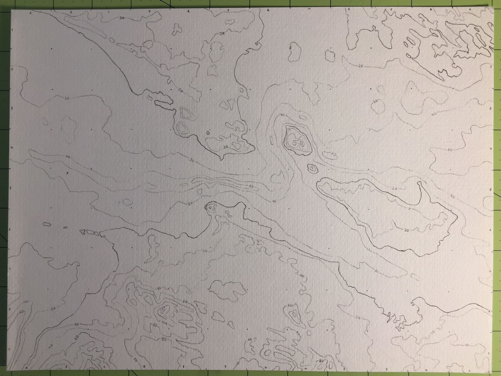 And this is the paper I drew on. On this 12×9 sheet, I drew a reference grid to match my contour map. It was actually a pretty tedious process.