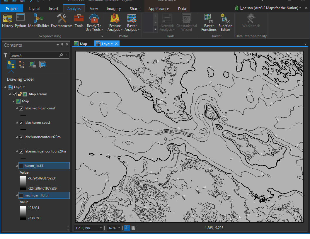 I created a reference contour map in ArcGIS Pro, to make my life much easier (as is my way). I downloaded a set of outstanding DEM geotiffs from NOAA with elevation data above and below the coastline.