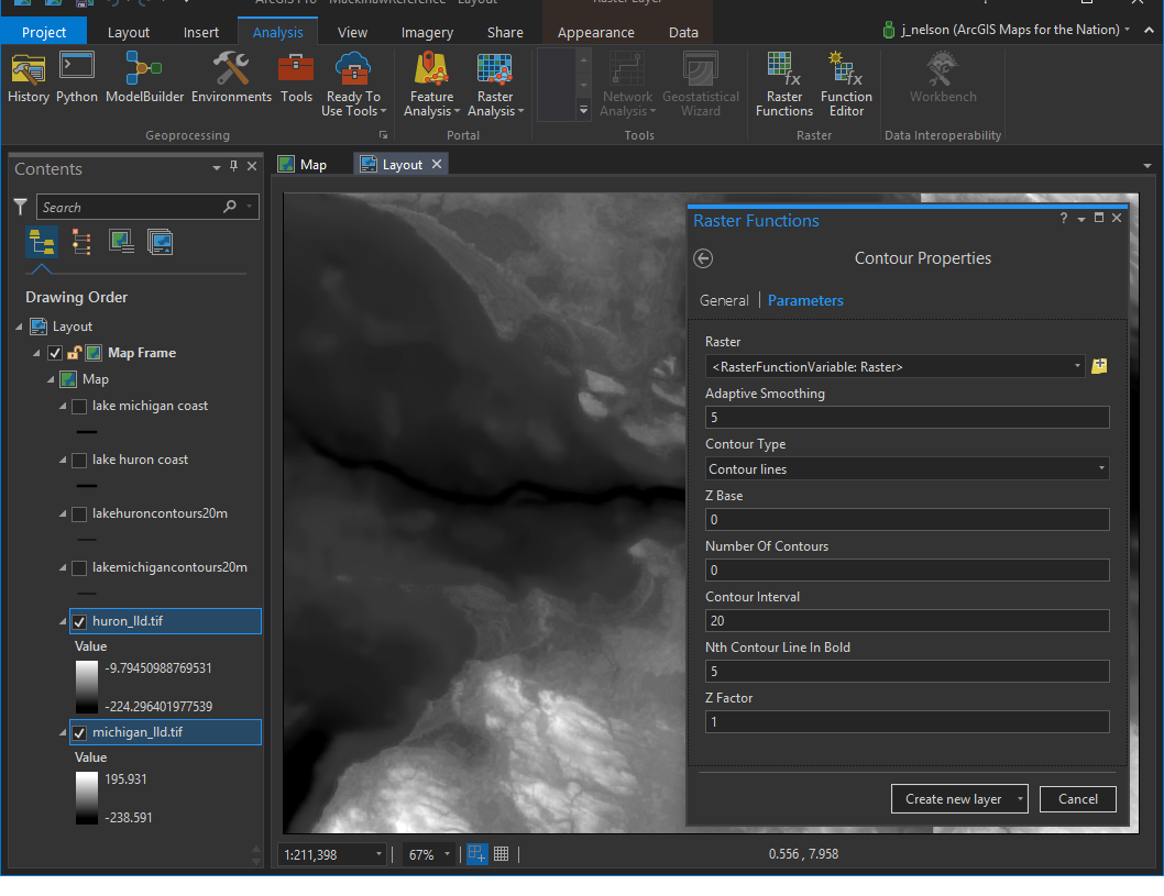 I used a glorious, almost magical, raster function to create contours, every 20 meters.