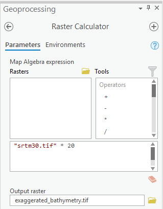 First step is to acquire the raw Digital Elevation Model you want to use as an elevation surface. For this map, it’s the SRTM 30m bathymetric DEM. It’s just a raster grid, with each cell representing elevation (or, in this case bathymetry). To create an exaggerated version fire up the Raster Calculator, use your raw DEM data as input and specify your vertical exaggeration as a multiplication of the values in the raw data – here “srtm30.tif” * 20.