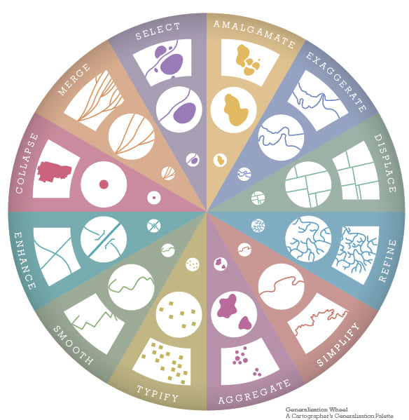 If cartographers didn’t exaggerate you’d often struggle to see features, assess their relative importance across other map detail, or see clarity in their relationship with other features. Exaggeration is a fundamental part of the map-makers generalization toolkit even though you may never really notice it when you look at a map. Here’s the generalization wheel that my colleague Wes Jones made (published in Cartography. by Esri Press) that shows how exaggeration fits into the wider toolkit.