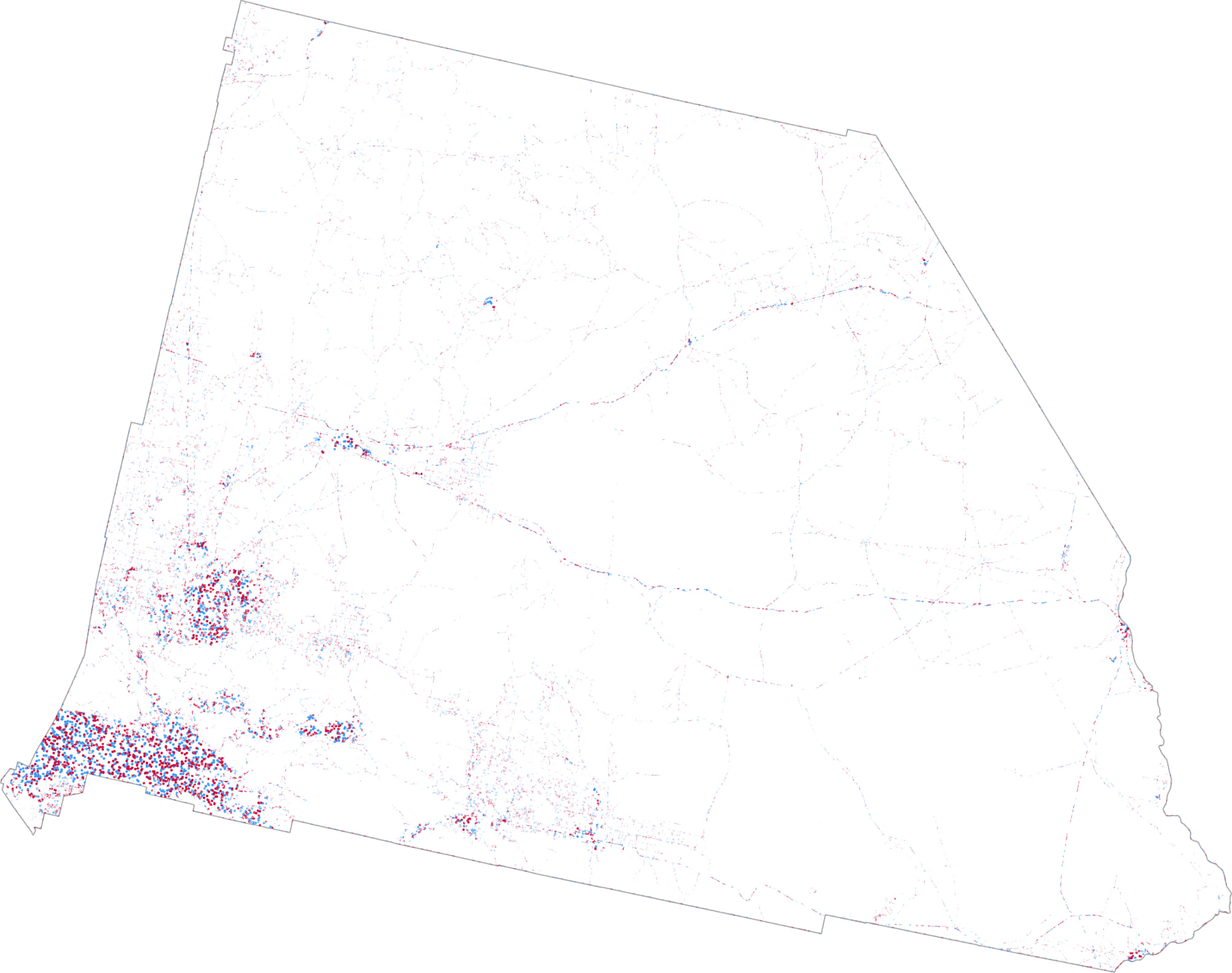 Again using San Bernardino county in California, and the 2020 Presidential election results as an example, a standard dot density map would position blue, (Democrat), red (Republican) and orange (Others) dots like this: