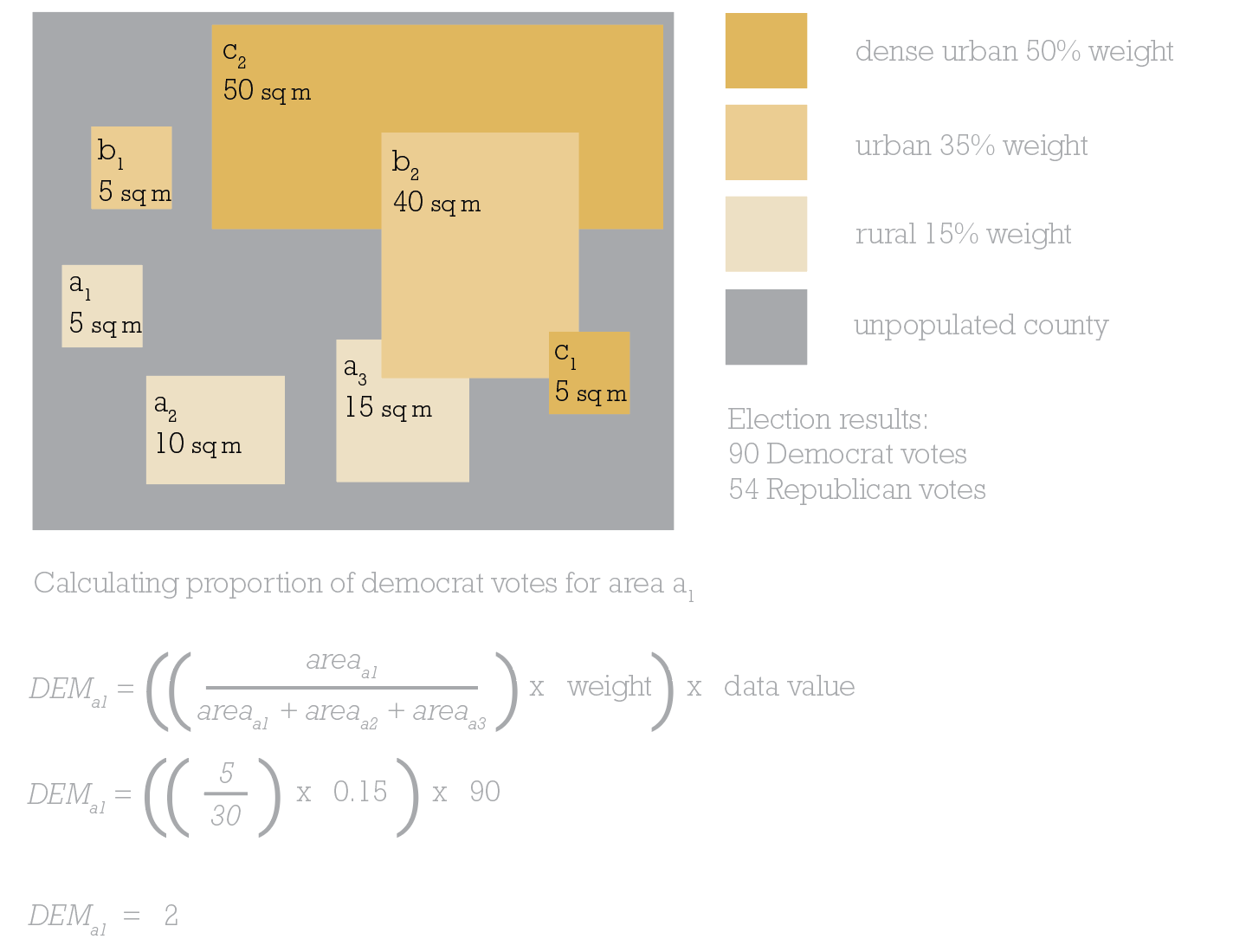 To calculate the number of Democrat votes area a1 should be allocated, divide its area by the total area of rural polygons (30 sq miles,) then multiply by the weighting value (15%, therefore 0.15), and, finally, multiply by the data value we want to find a proportion of. In this example it’s 90 as we’re wanting to find out what proportion of Democrat votes from the county level need to be reallocated to area a1. And the answer is 2. So if I’m creating a 1 dot to 1 vote dasymetric dot density map then 2 of the Democrat dots need to be randomly positioned in area a1.