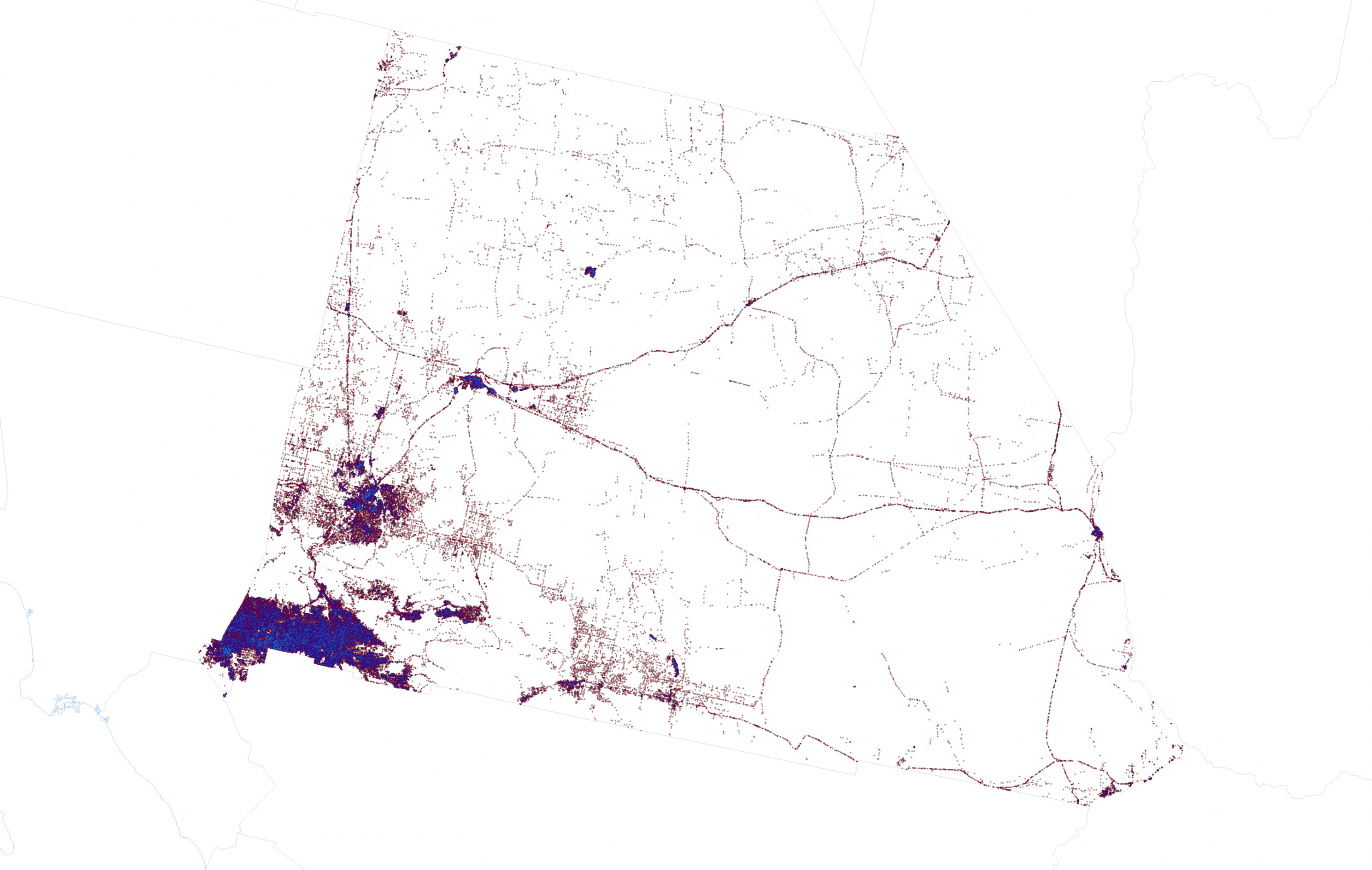 The impression is that the state is equally, and homogeneously populated everywhere. But it isn’t. In fact, the vast majority of the county is classed as scrub or barren according to the US National Land Cover Database. Only the dark areas on the following map derived from the National Land Cover database are urbanised. It shows cities and towns as well as the network of highways that interconnect them. And that’s where the vast majority of people live, work (and spend time at the wheel!). So it might make sense to show the dots in those areas that people inhabit rather than spread them across areas where people simply do not inhabit.