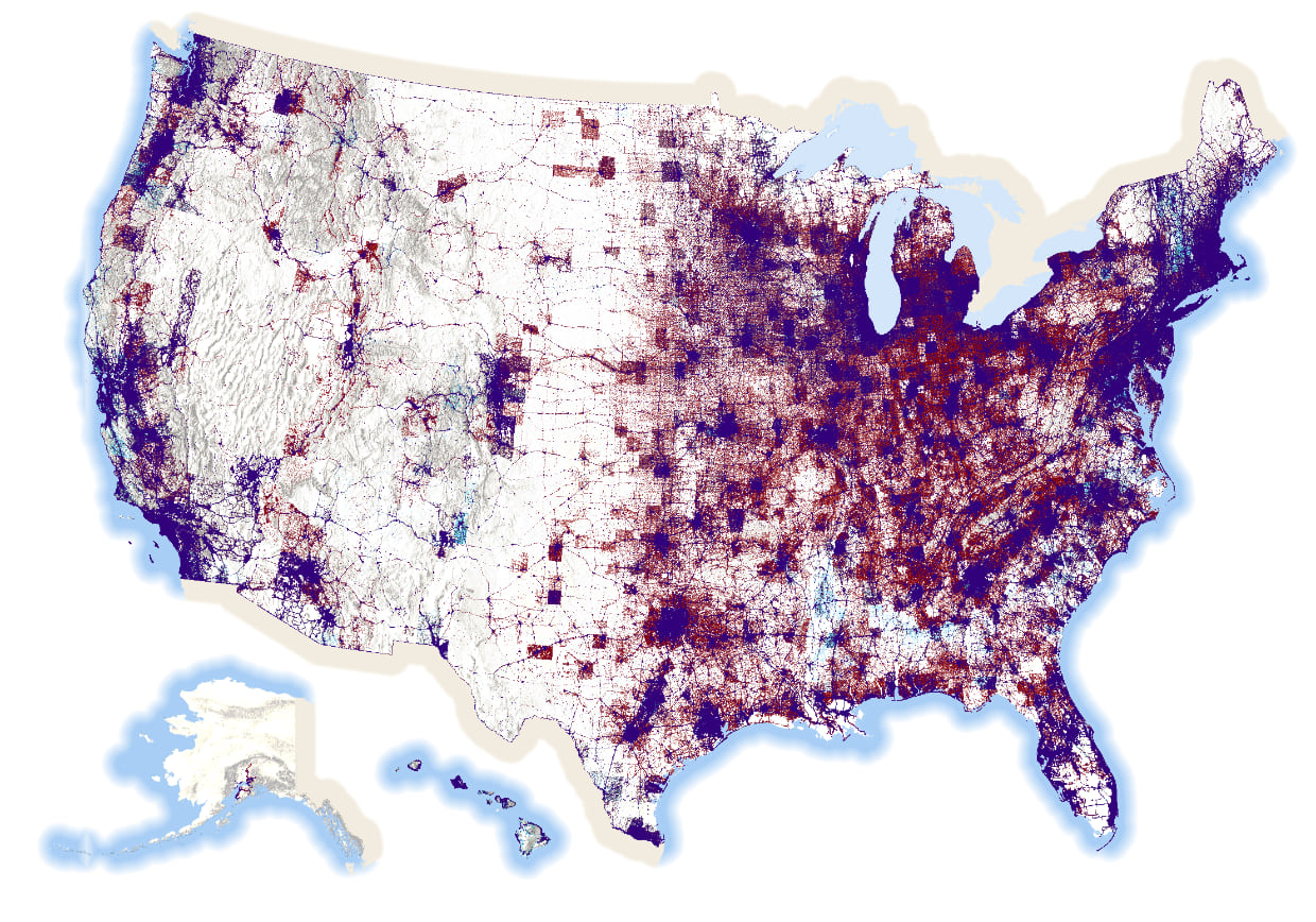 This artifact occurs because a highly populated county, by virtue of a relatively large metropolitan area, is surrounded by very sparsely populated counties. The reapportionment of the data from the densely populated county uses urban areas right up to the edge of that county. There simply aren’t the same amount of dots that get reapportioned in the surrounding counties so a ghostly border is formed. I could likely finesse this a little more to get a smoother gradient between urban and rural but frankly I have dots before my eyes.