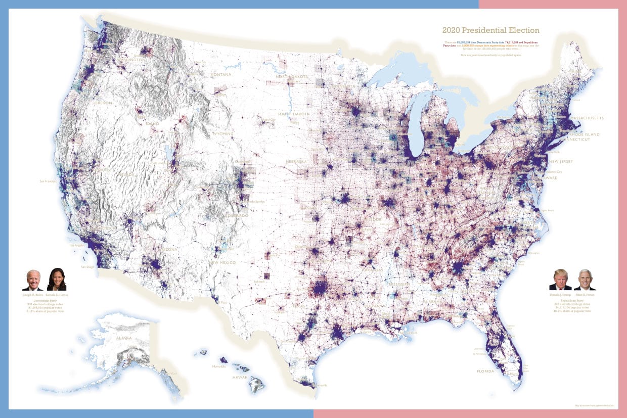 There’s 81,268,924 blue dots, 74,216,154 red dots, and 2,898,325 orange dots on this map. In total, there are 158,383,403 dots on this map. One dot for every single person who voted. That’s a lot of dots on a map.