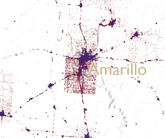 No map is perfect though and if you look closely you can still see the structure of many county boundaries where it appears that the voting population suddenly stops at an invisible edge. Look at this closeup of Amarillo.
