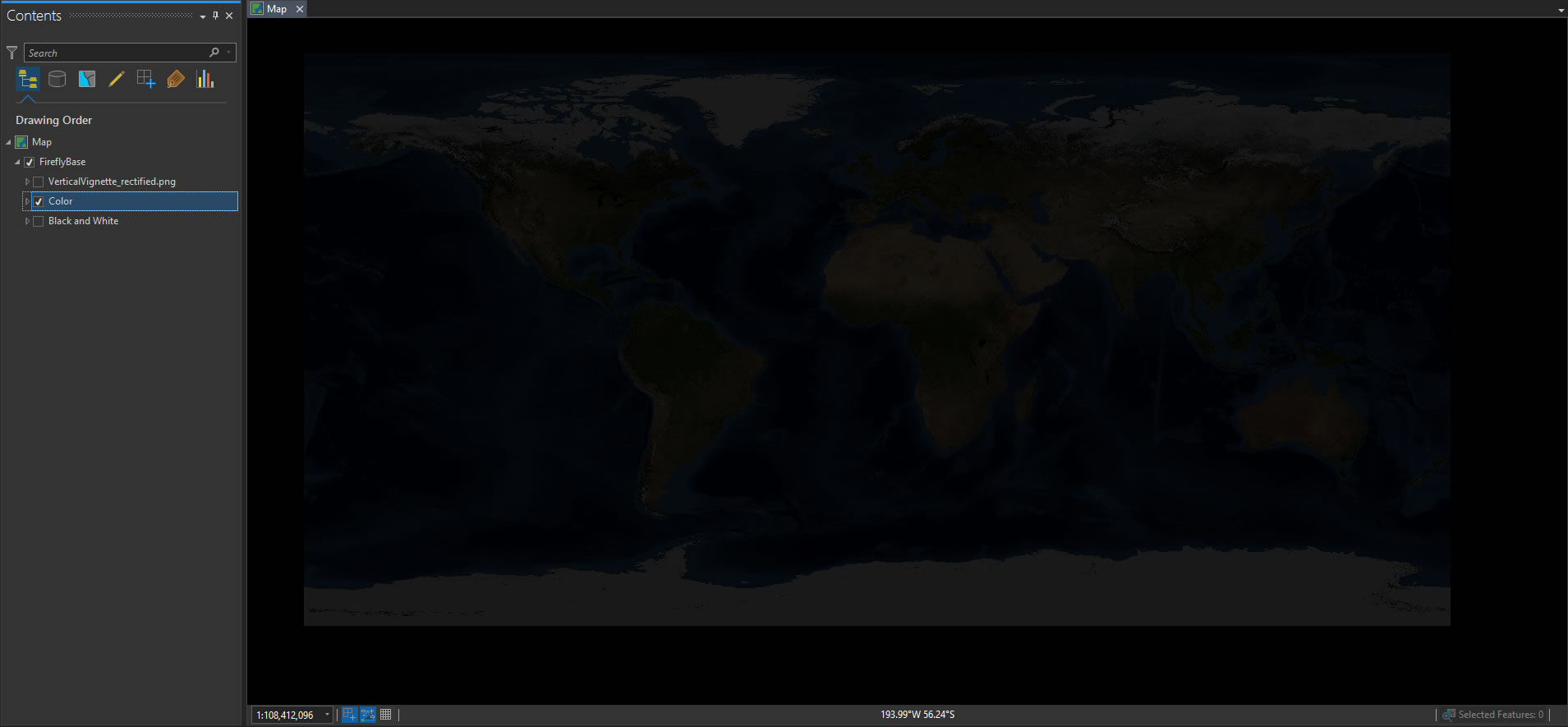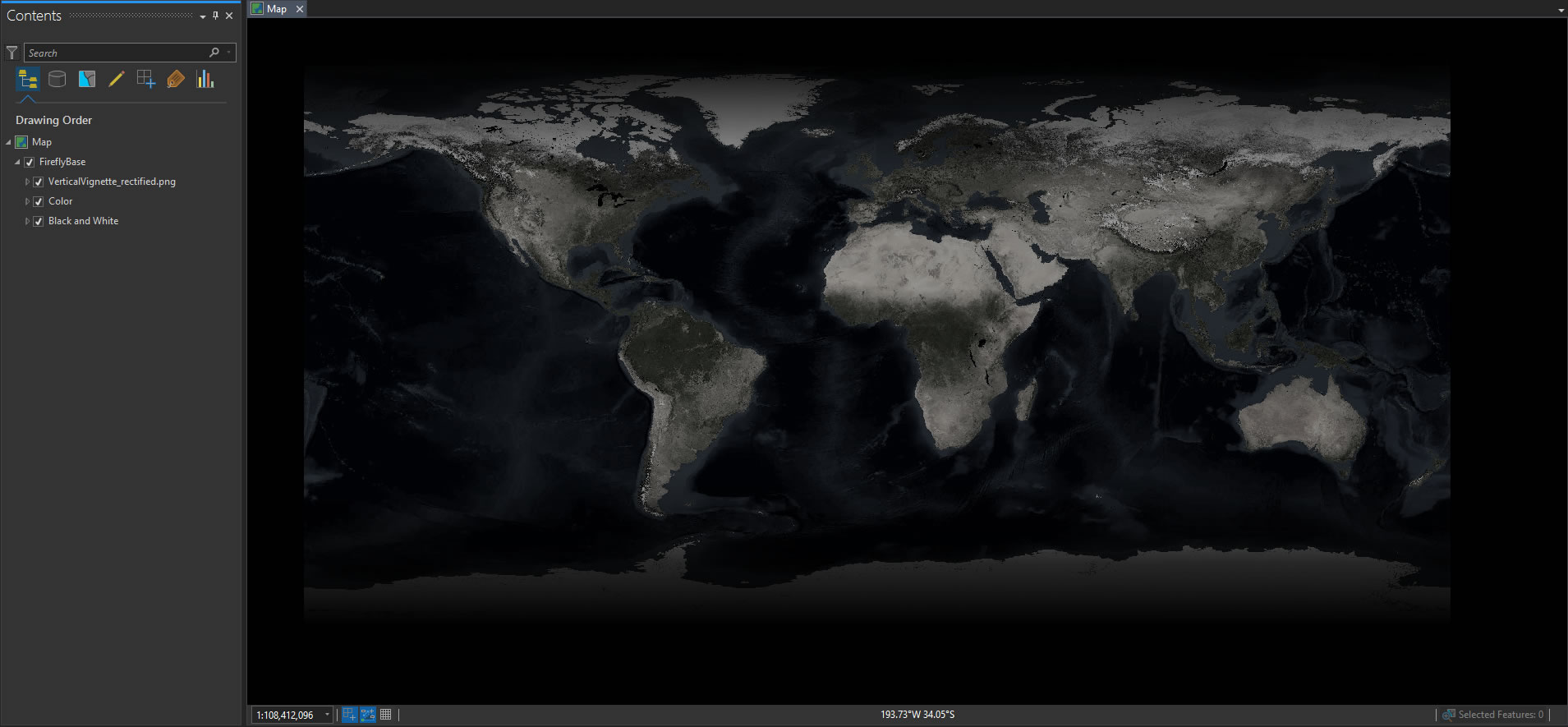 Ok, now we’ve got that all squared away, here is a resource for ArcGIS Pro users to get rolling on some firefly cartography. It is a mega-huge ArcGIS Pro project download (355MB what??) with all of the NASA imagery packaged up into it. So get the coffee maker rolling, hit download, and kick back. When you open it up, it will look like this…