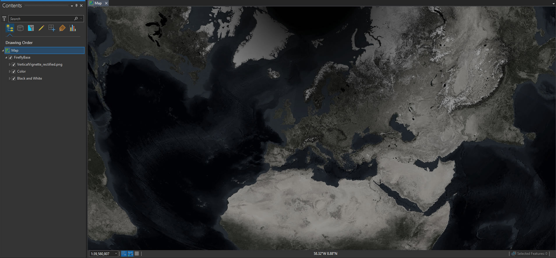 A hallmark of a firefly map is the dark, desaturated imagery basemap. The easiest, fastest, way I’ve found to do this (you could probably use a raster function, alternatively) is just make two copies of the imagery. The bottom layer is set to black and white and the top layer set to color. Here are the settings I used: