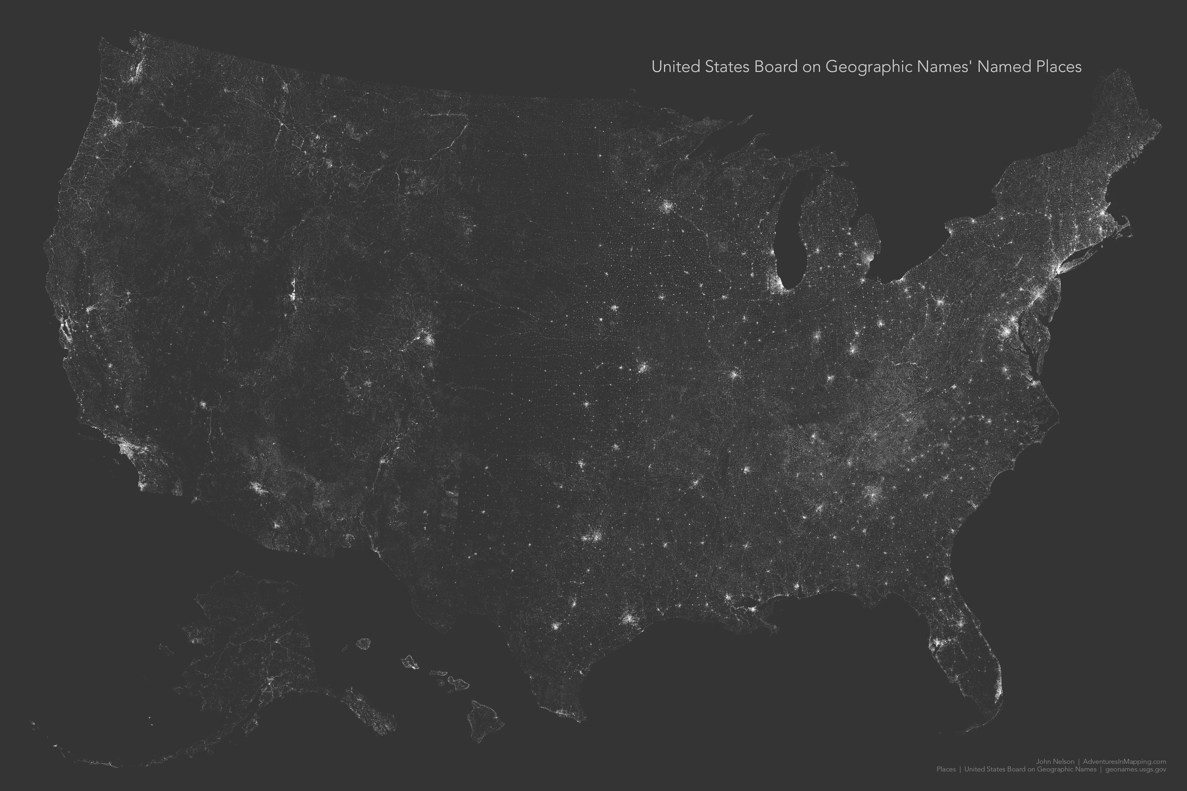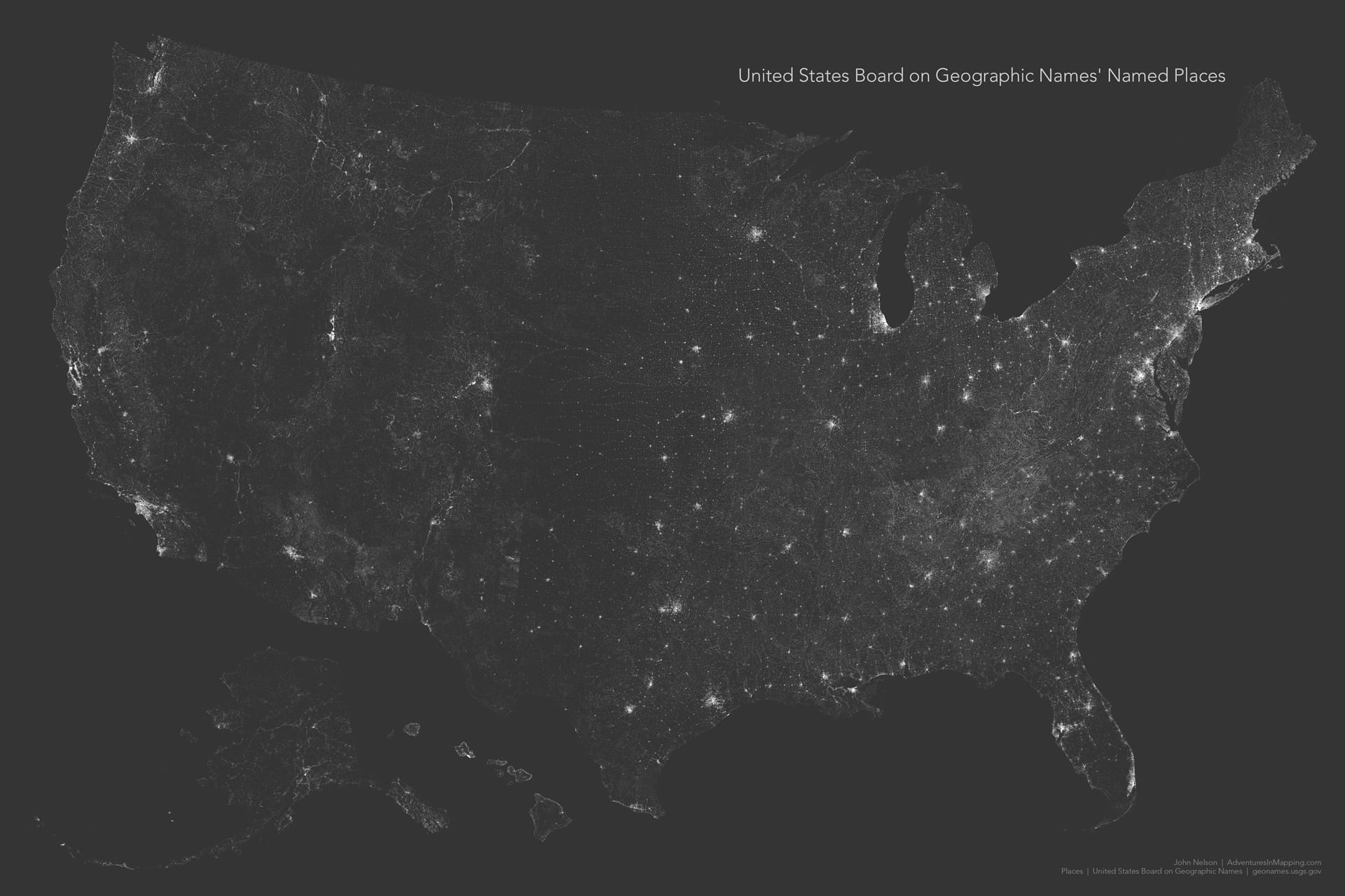 Whoahhhhhh. Let’s pull back on the reigns for a second here. Check that out! This is just a map of 2.3 million dots. It isn’t a map of the earth at night, it’s not a map of rivers or rail lines or highways or coasts. It’s just a pile of named places. But humans name places so the first order structure that arises at broad scales is that of humanity’s settlement patterns along paths of convenience. So it becomes an emergent map of rivers, transportation, valleys, and coasts—a pointillist portrait of us as the existential minutiae that settles into the folds of earth.