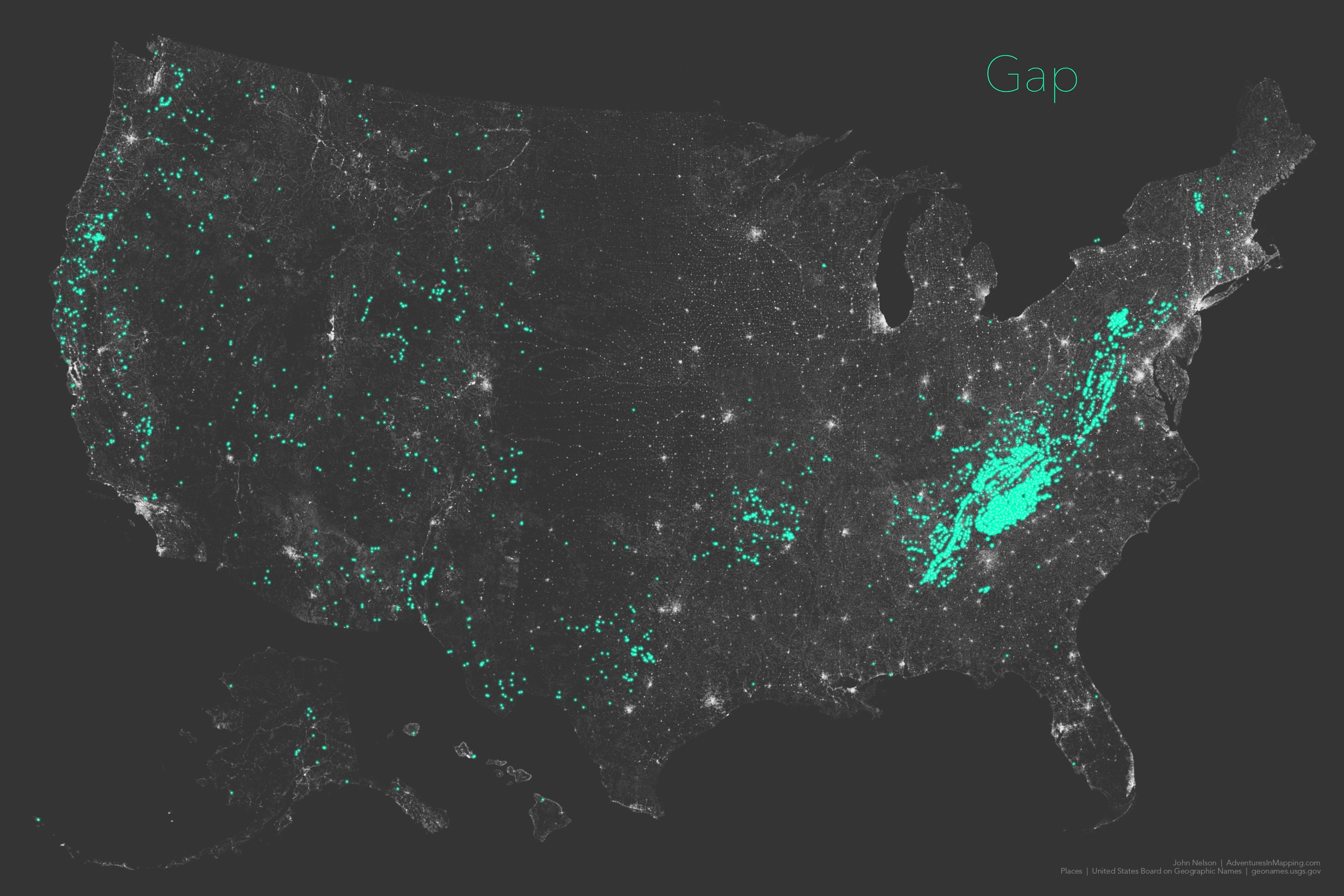 Not just a valley, which might lead you right to a beautiful but ultimately perilous dead end, but an honest to goodness way through. Some time ago I was traveling through the Smoky Mountains and came across something or another that told me the term “Gap” was used in that area, while “Pass” was a more common name further west. Inspired by the beautiful work of Topi Tjukanov and Derek Watkins, I thought I might see with my own eyes if this talk of regional gap/pass naming rang true.