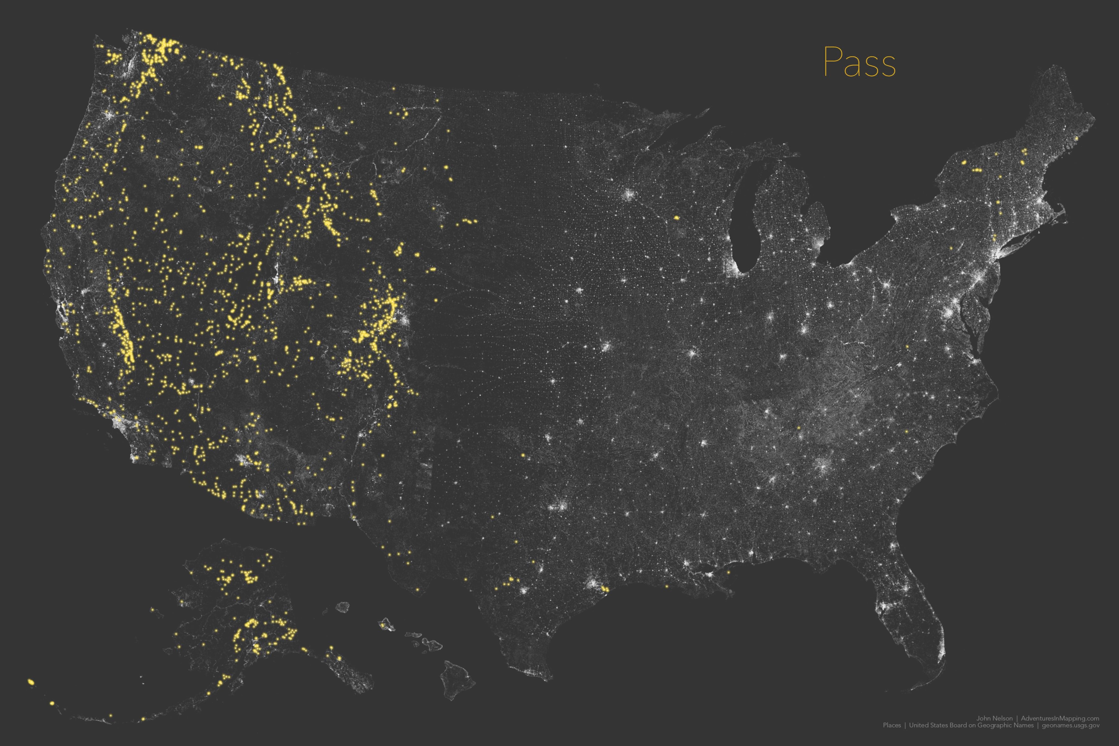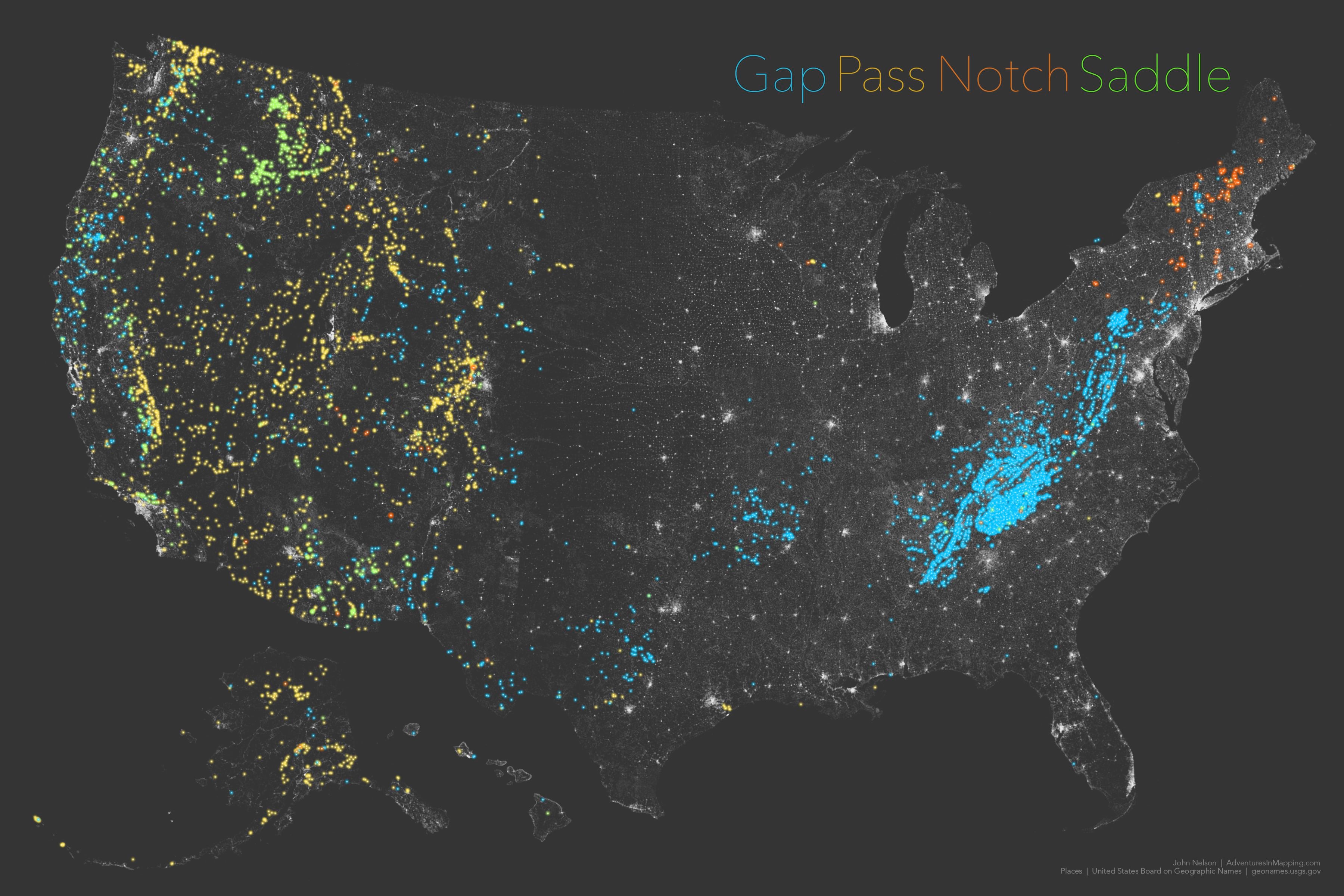 I’m sorry, where was I? Blipped out there for a second. Oh, right, passes and gaps and stuff. Here are those sorts of things, as categorized by the U.S. Board of Geographic Names…