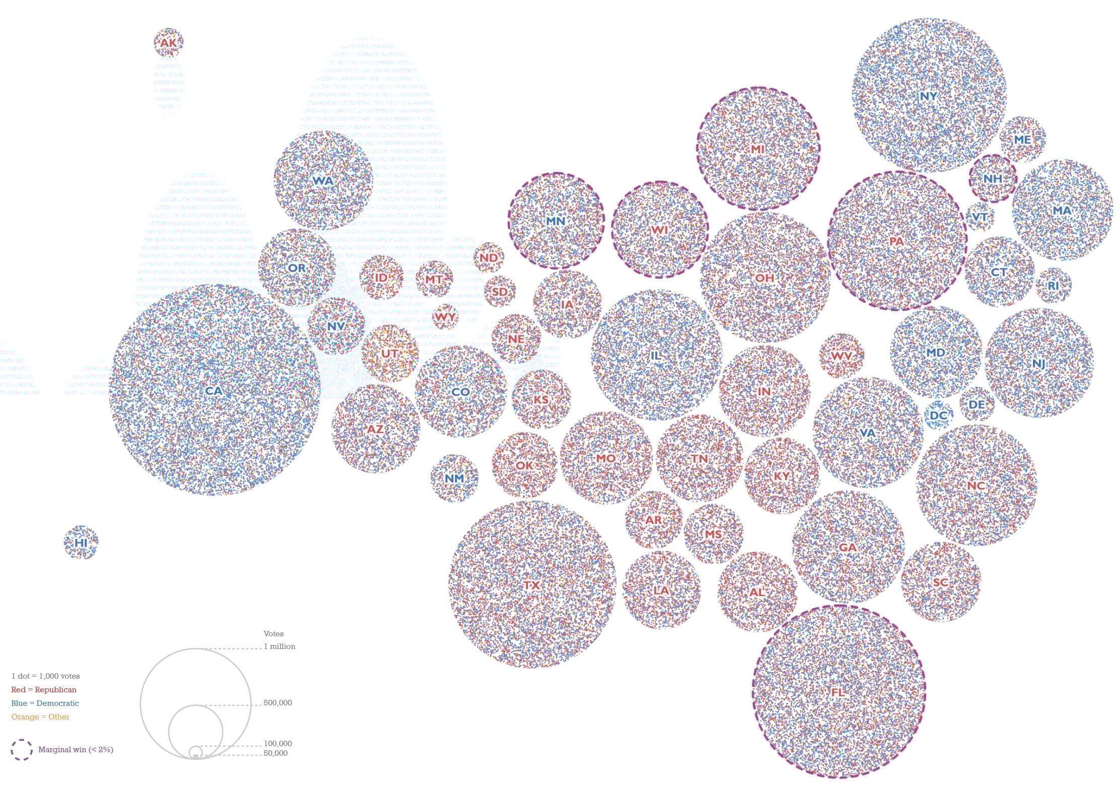 This version of the state map, sized by total votes has used the dot density renderer to symbolize each area with dots representing Republican and Democrat votes which creates a purple mix that tends slightly towards blue for Democratic states, and towards red for Republican states.
