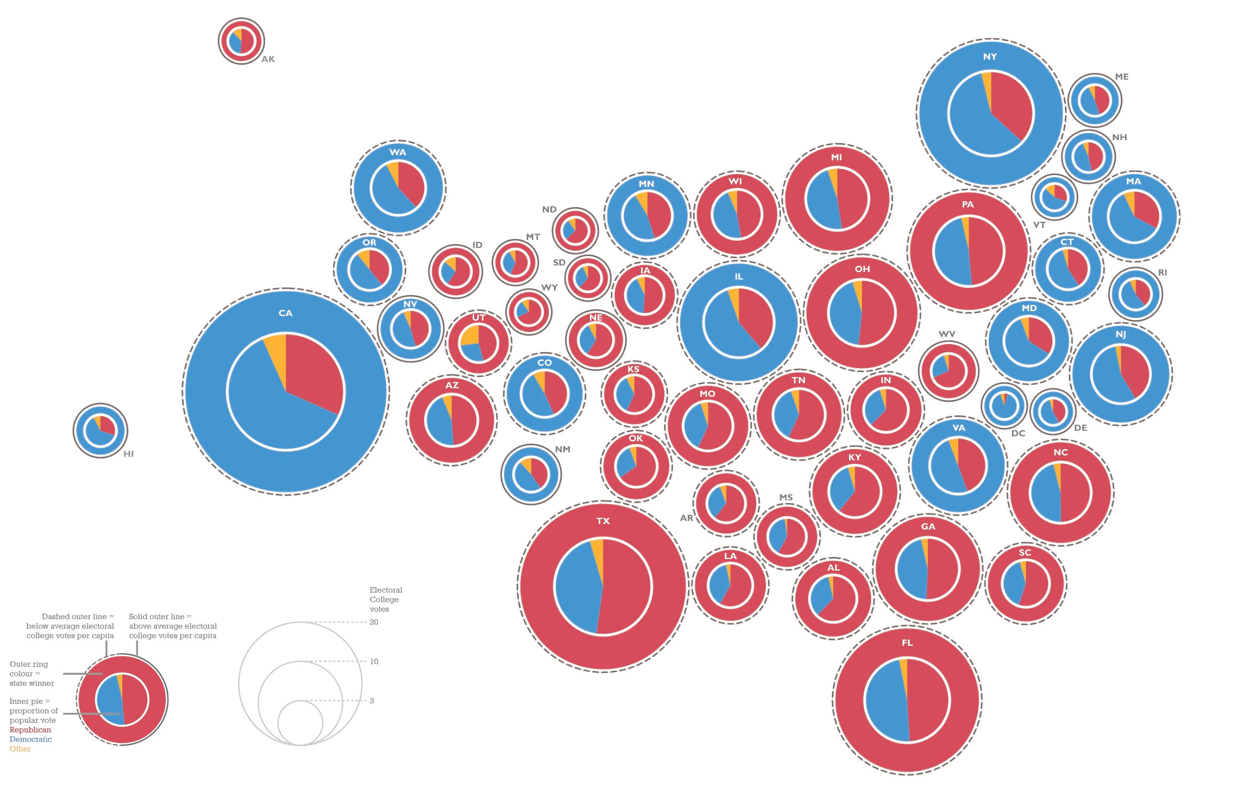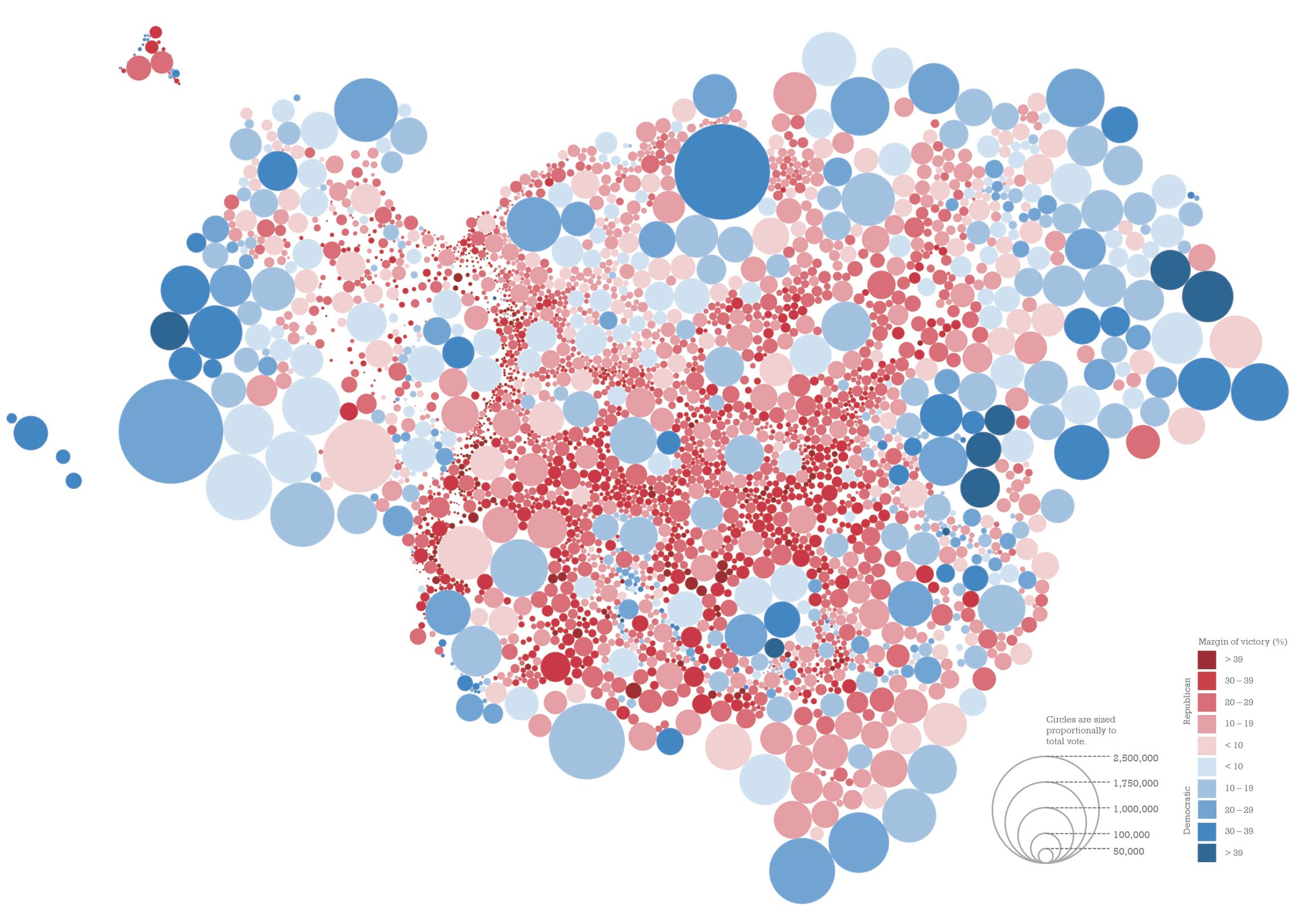 And, of course, once you’ve created your cartogram you can use the new feature class combined with all sorts of other mapping techniques to create interesting versions of the cartogram. Here’s just a few I created for Thematic Mapping which focused on the way in which you can make very different maps of the 2016 Presidential election. Here’s a few examples that use a Dorling cartogram as a basis for making more interesting multivariate thematic maps.