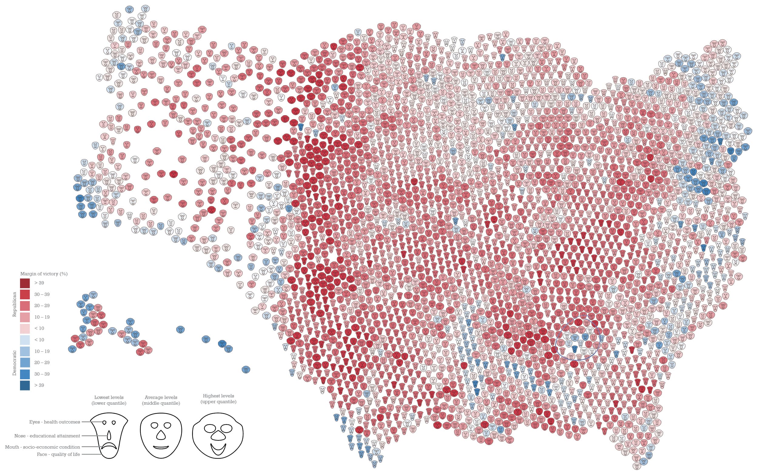 And if we use the same value to scale each county then we get a cartogram with the same sized symbols, which can then be used as a structure to be a bit more inventive with the symbology, here using multiple symbology layers driven by attribute connections to build multivariate Chernoff Faces symbology.
