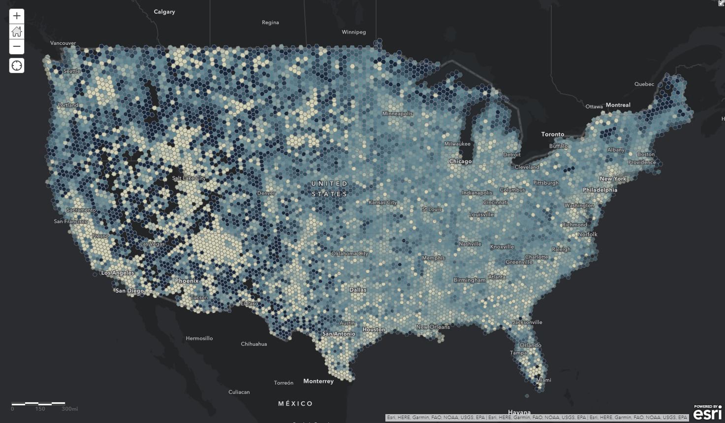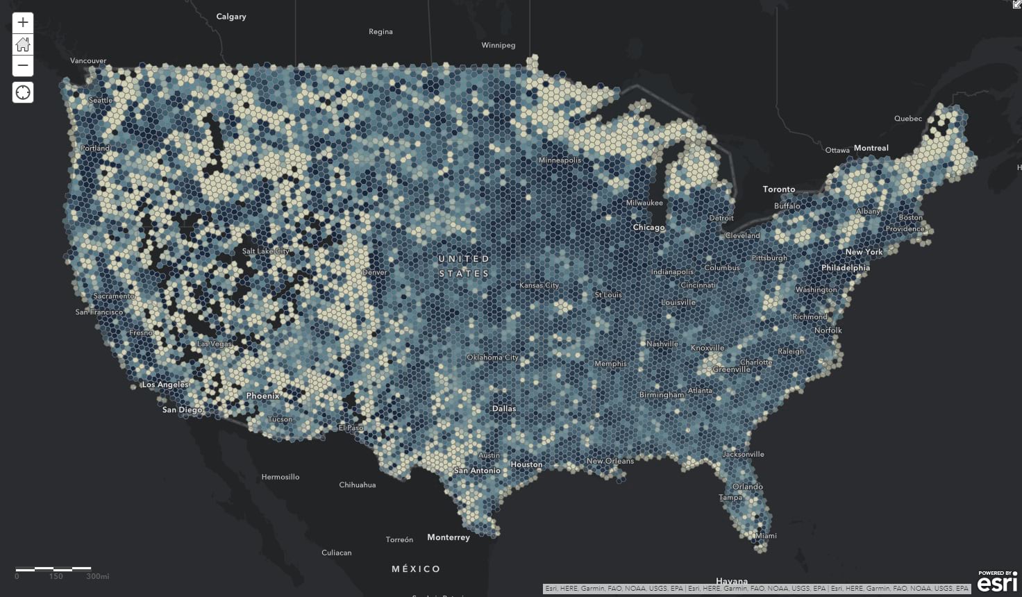 Most population data happens to be available in political geographic units (like counties or census tracts, or even the bizarre mysterious Zip Code Tabulation Area, etc.). That’s cool, but political polygons are inherently pre-disposed to wild scale and population differences and can result in some potentially misleading, or just insight-occluding, Choropleth results. This layer tries to isolate those variables by giving you a geographic layer where each cell (which, of course, happens to be hexagonal) is the same size (30KM), the same shape (you know, mostly), and comes pre-stuffed with population counts so you can readily normalize your data.