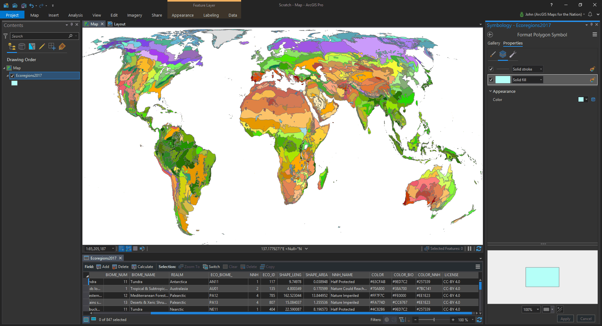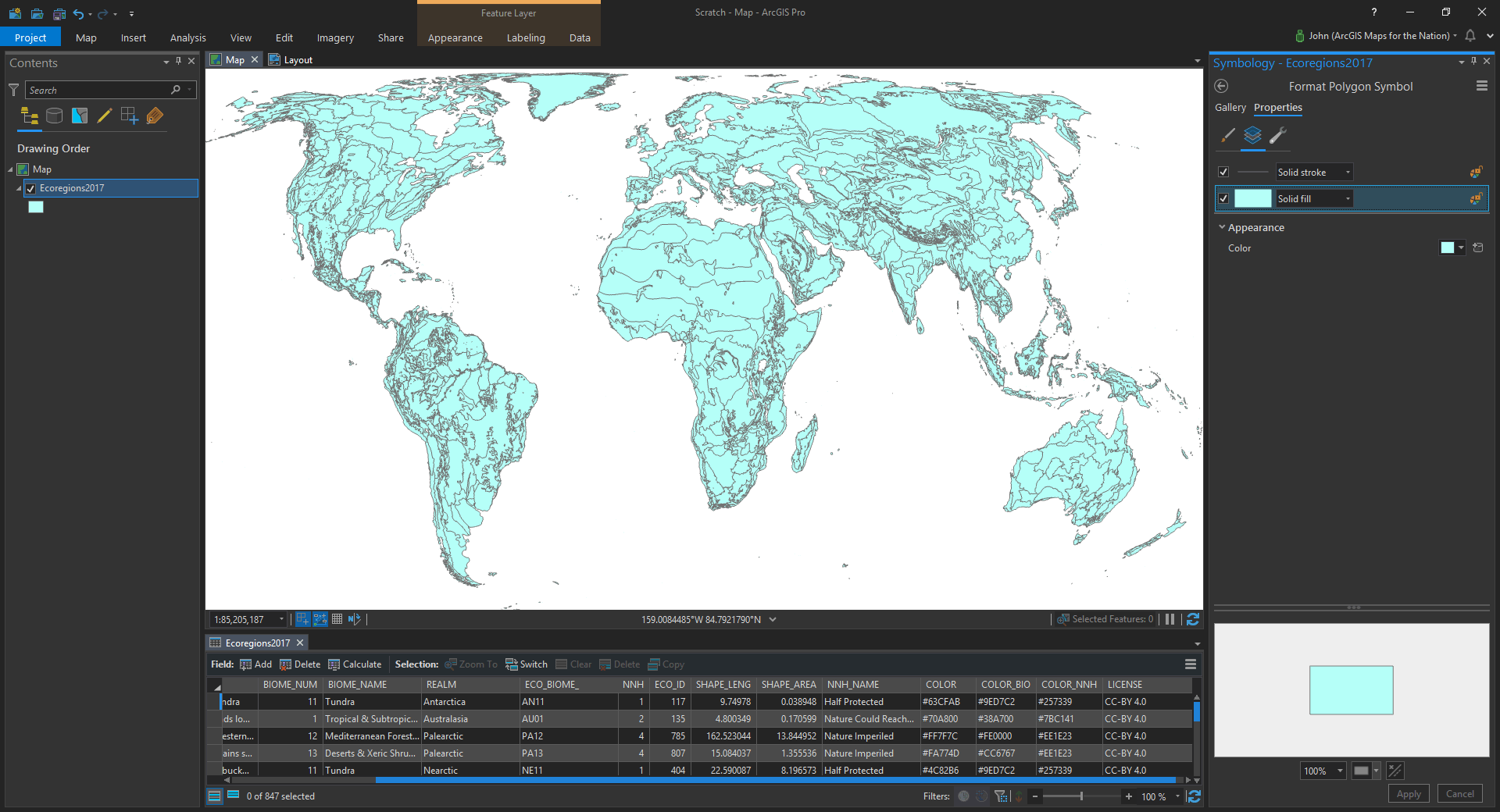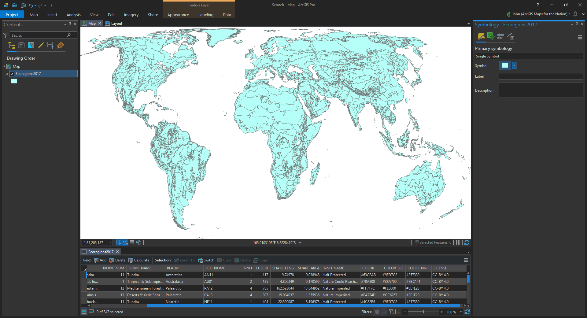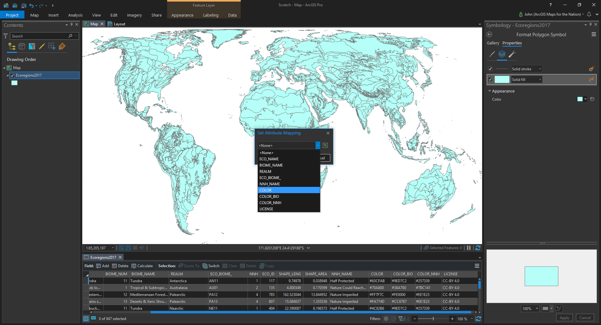 Here it is downloaded and added to ArcGIS Pro. And check it out, there are hex colors provided in an attribute for all these ecoregions! Who’s ready to manually copy and paste 538 hex colors into a symbol list of unique values? Not me!