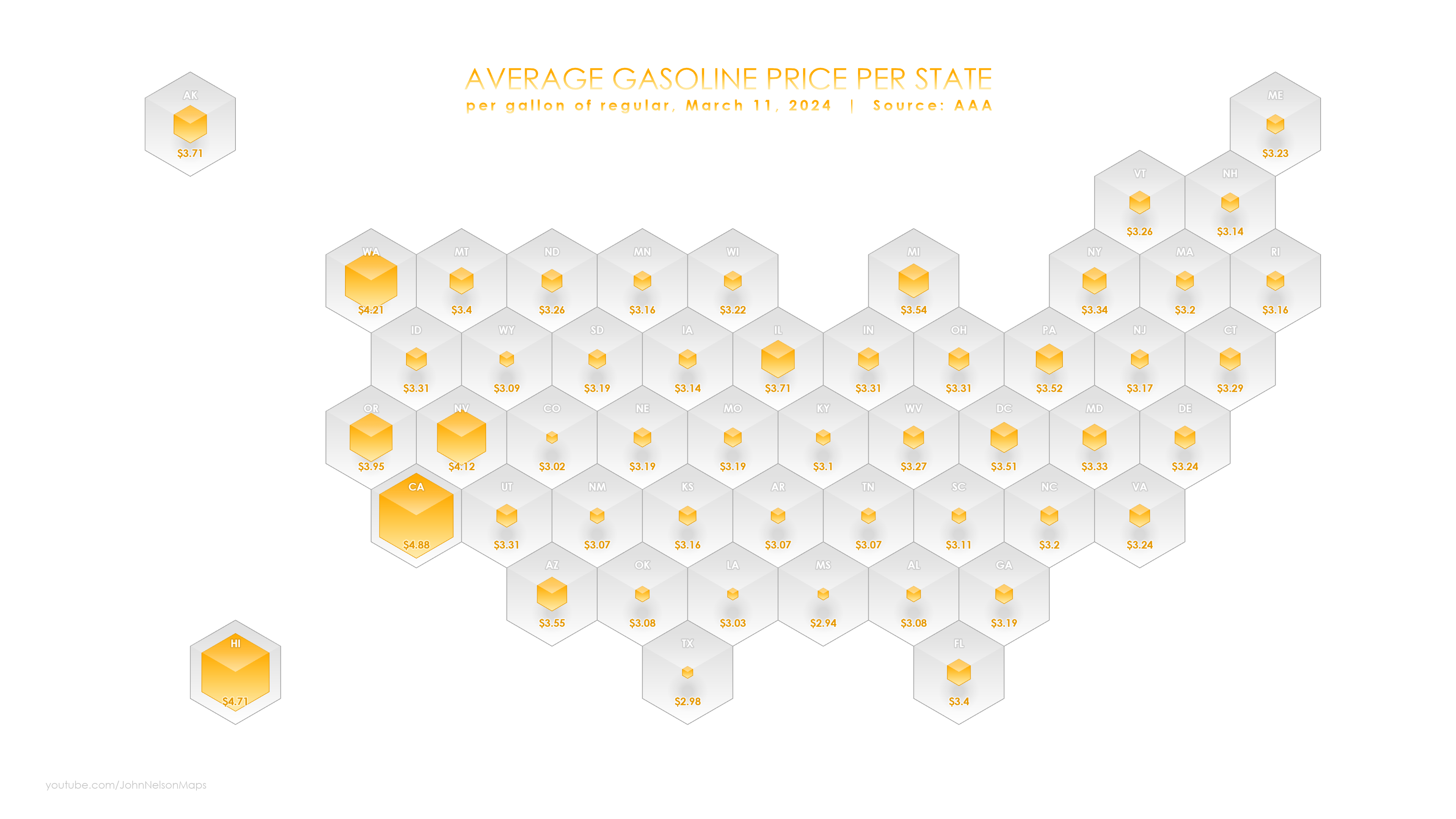 But…well…sometimes a map, strictly speaking, can have some issues. That’s ok though, because maps are here to fix the problem with maps! Say what? What’s the problem, you might be wondering? Well sometimes the phenomenon that we want to illustrate via a map suffers from the exactitude of the size and shape of the things on the map. For example, there are really big states in the US (looking at you, Alaska and Texas) and some really small ones (ah-hem, Rhode Island…and Delaware?). Some borders are simple (Wyoming) and others are exceedingly complex (Maryland). Showing all these states in their actual shapes and sizes can introduce unwanted variability. For instance, what if I just want to see a map-like thing showing average gas prices per state? I don’t want to be distracted or swayed by the actual state areas, but I do want to see, generally, if there are geographic patterns or regions where gas prices are higher and lower.