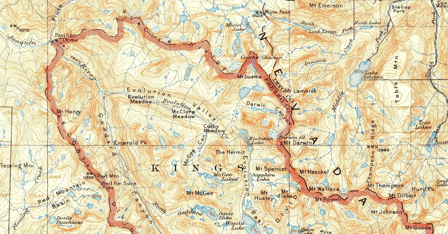 Yesterday in Sarah Bell’s blog post sharing her new custom font, I really liked one of the maps she provided as an inspiration. A USGS topo quad for Mt. Goddard, CA, which included a bit of King’s Canyon National Park. It inspired me too, but what caught my eye was the handsome red hatched area of interest ribbon surrounding the park.