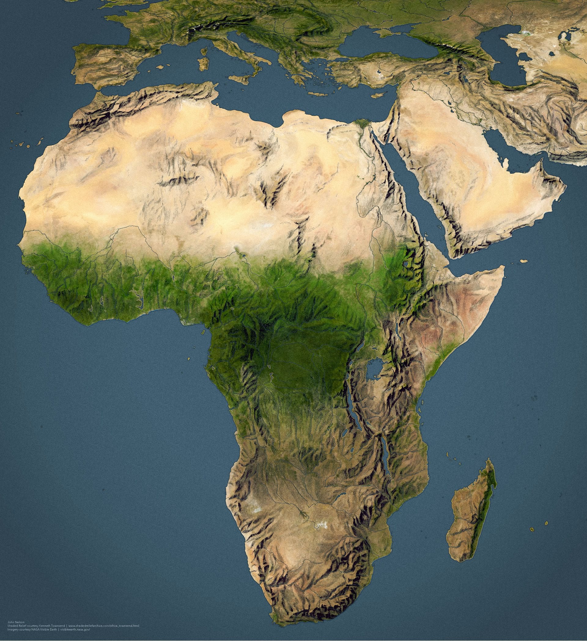 Here is a merging of hillshade, hand-painted by Herwig G. Schutzler in 1965, with modern NASA imagery.