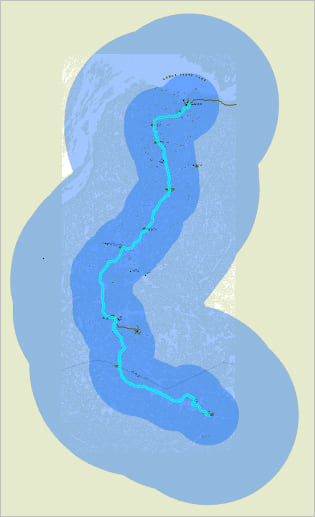 4. In the Contents pane, remove the worldLand layer, which is currently serving as your background, and drag the 120 km buffer layer to the bottom. Turn off the 40 km buffer layer for now.