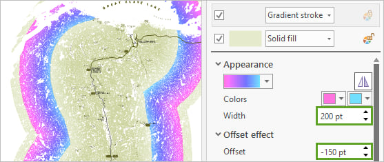 9. On the Symbology pane for the 40km buffer layer, change the Offset effect of the gradient stroke to -50 pt.