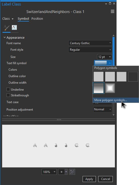 3. Then, for any text, including labels, go to the text fill symbol dropdown and choose “more polygon symbols”. Because fonts are just polygons. Polygons that ushered in an immortal communications mechanism giving rise to society itself!
